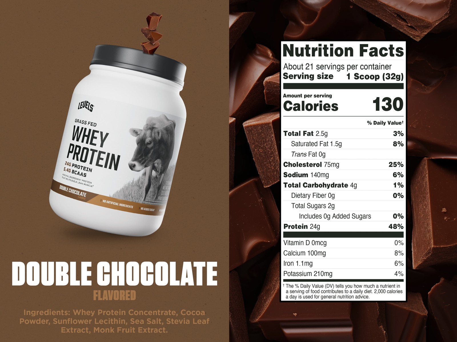 Real ingredients just taste better. That’s why we only use a blend of rich cocoa, natural sweeteners and hormone-free* whey. You’ll find no deception here either. That means no added sugars, no soy, no gluten, no artificial ingredients, and no bogus fillers. Made with minimal ingredients that don’t sacrifice on flavor. Whey concentrate is the least processed form of whey, which means it’s loaded with high-quality complete protein and essential amino acids. The branched-chain amino acids (BCAAs) found in whey protein can help build lean muscle and support post-workout recovery.‡ LEVELS WHEY PROTEIN: Each scoop of Levels Double Chocolate Whey contains 24g Protein, 5.4g BCAAs (branched-chain amino acids), and no added sugars. Trusted by athletes, fitness enthusiasts and daily grinders everywhere, our whey is crafted for everyone’s lifestyle. NOTHING FAKE: Levels Whey is naturally delicious. That means no hormones, no GMOs, no added sugars, no soy, no gluten, no fillers, and no artificial flavors or sweeteners. SIMPLE & CLEAN: No fake chocolate flavor here. Levels Double Chocolate Whey is made with deliciously rich cocoa and lightly sweetened with monk fruit extract. QUALITY FIRST: Quality milk tastes better, way better. That’s why we choose grass-fed and hormone-free dairy to make our whey protein concentrate. Whey concentrate is the least processed form of whey, which means it’s loaded with high-quality complete protein and essential amino acids. Each batch is cold-process microfiltered and blended with non-GMO sunflower lecithin for that insanely easy mixing you expect. Ingredients Whey Protein Concentrate, Cocoa Powder, Sunflower Lecithin, Sea Salt, Stevia Leaf Extract, Monk Fruit Extract./div>