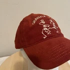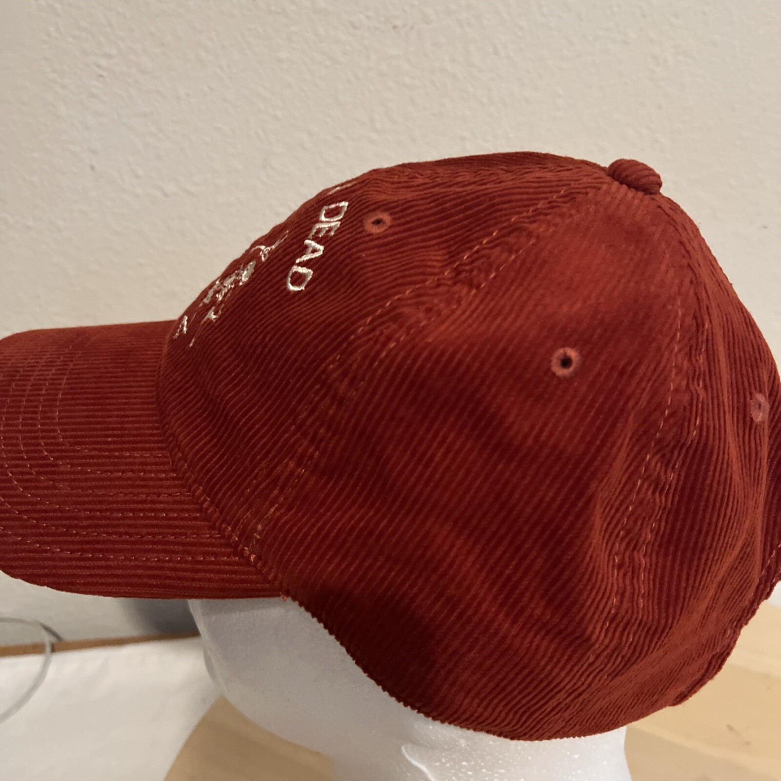 This Orange Corduroy Grateful Dead Cap features dancing skeletons, making it a unique and vintage piece suitable for casual occasions. The hat is crafted from cotton corduroy material and has an adjustable strap for a comfortable fit. With its retro music theme and bold color, this baseball cap is a stylish accessory for fall, perfect for fans of the Grateful Dead.