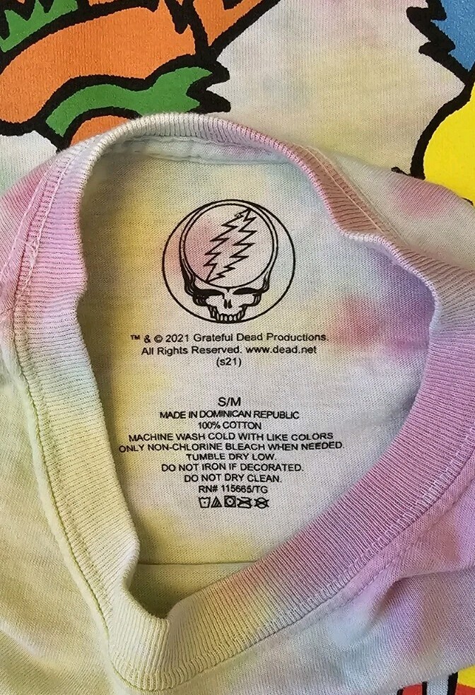 This Grateful Dead Men's Size Small Graphic T-shirt in a tie-dye pattern features a classic hippie character design, perfect for fans of the 60s theme. Made of comfortable cotton material, this crew neck shirt with short sleeves offers a regular fit for everyday wear. Representing the iconic Grateful Dead brand, this multicolor shirt is a stylish and comfortable addition to any man's wardrobe, ideal for those looking to showcase their love for the band and their unique style.