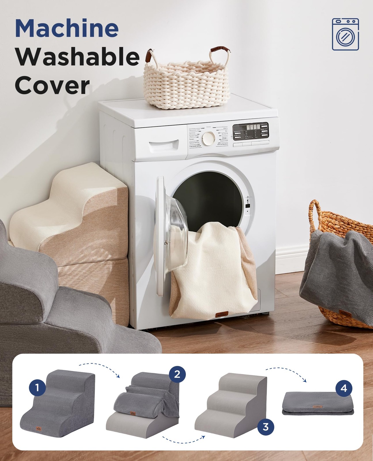 Grey Curved Dog Stairs Ramp for High Beds 28.7" H, 5-Step Dog Steps for Small Dogs and Cats, Pet Stairs for High Bed Climbing, Non-Slip Balanced Pet Step Indoor COMFORTABLE PET STAIRS - This foam dog stair is designed directly against the edge of a bed, sofa or other furniture, so your pet can climb up and down comfortably. SPECIFIC AND STEADY DESIGN - 35D density of pure foam make this stair more steady when your pets walk on. The dog bed stairs can provide strong support for pets in the walking process. Low angle slope design can better protect your pet's joints. MULTIPLE STEP SIZES - This dog stair has 3 steps, 4 steps and 5 steps to choose. Our 3-step stairs fits for chair/sofa/bed up to 17inch. 4-step stairs fits for chair/sofa/bed up to 23inch. And 5-step stairs fits for chair/sofa/bed up to 29inch. EASY TO CLEAN - The dog step has a removable washable cover made of bonded fleece that can be hand washed or machine washed, so you don't require spending a lot of time cleaning it. It's very convenient. CARE INSTRUCTION - After removing the foam from the compression bag, please allow 24-48 hours for the foam to fully expand before use. No need to set the cover. Please note that the inner foam is not washable.