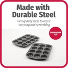 SET OF 2 12-CUP MUFFIN PAN: Ensures a perfect bake every time for your favorite muffin and cupcake recipes PROVIDES EVEN HEAT DISTRIBUTION: Distributes heat evenly for thorough baking SCRATCH-RESISTANT NONSTICK COATING: Nonstick coating provides excellent release with or without cupcake liners DISHWASHER SAFE: Pan is dishwasher-safe to make clean up quick and easy MADE WITH DURABLE STEEL: Measures 15.3" x 10.75" x 1.2" and is made with heavy duty gauge steel to resist warping and offer high quality baking for years to come