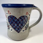 This Great Bay Pottery mug from North Hampton, NH is handmade from stoneware and features a round shape with a glossy finish. The mug is adorned with a heart theme, making it suitable for all occasions, including Valentine's Day. It has a printed back stamp and a 4-inch diameter, standing at 4.375 inches tall and weighing 13.5 oz. This original coffee cup is a piece of art pottery, showcasing the craftsmanship and creativity of the United States-made product.