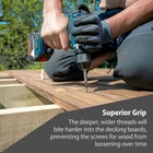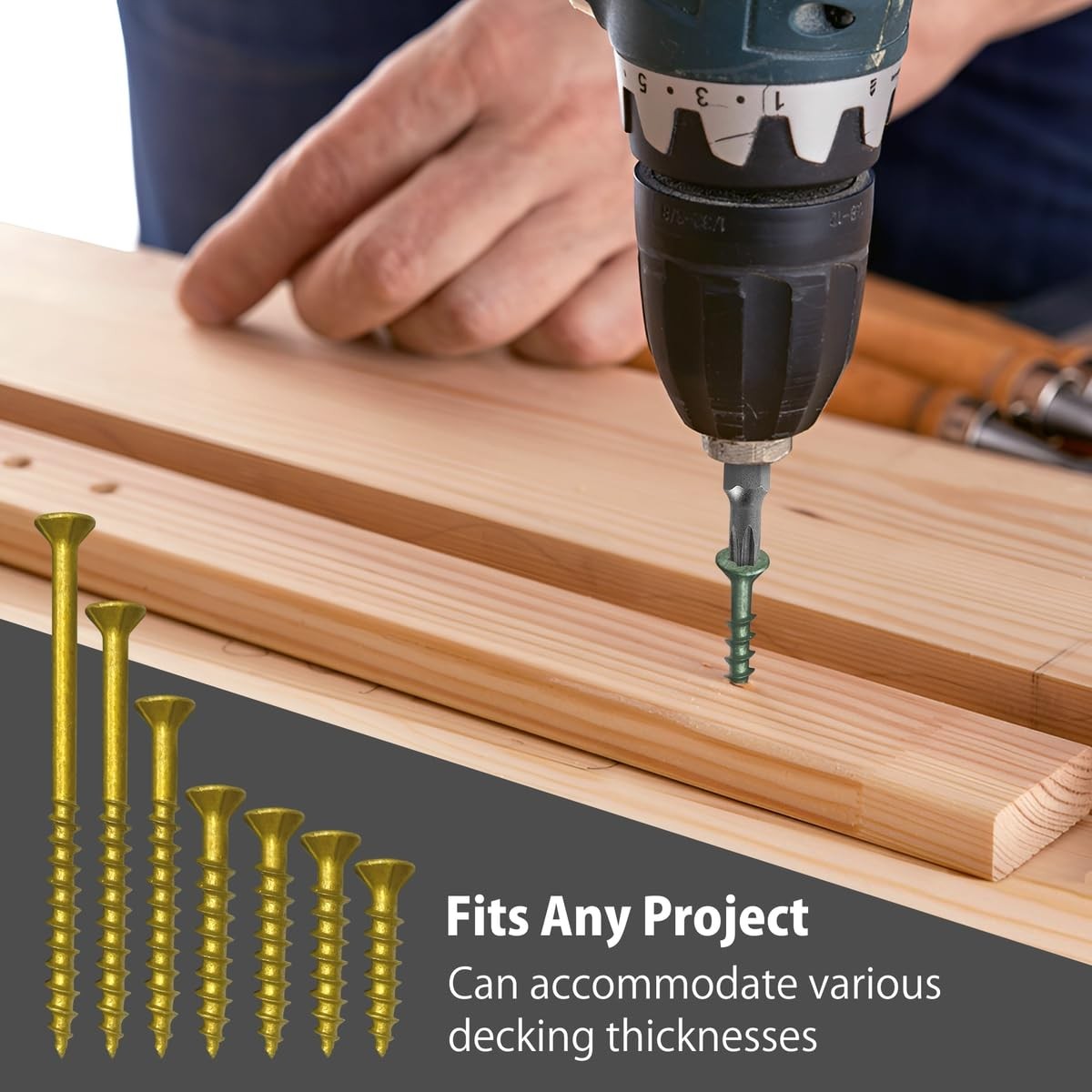 Deck screw, Wood Screw, Exterior Screw Durable Deck Screws - Take on any home improvement project with reliable materials. Our exterior screws come in 2 shades (green and gold) and 7 sizes, ready to answer all your home improvement needs. Effortless Installation - Each deck screw has a sharp point, flat head, and an optimized thread design. The metal screws will drive smoothly into wood, minimizing splitting and saving you time. Superior Grip - Say goodbye to creaky, wobbly, uneven floorboards. The deeper, wider threads will bite harder into the decking boards, preventing the screws for wood from loosening over time. Fits Any Project - Our assortment of sizes can accommodate various decking thicknesses. Get 2 inch deck screws to revamp your patio or take on a bigger undertaking with 4-, 5-, or 6 inch wood screws. More Than You'll Ever Need - No more running back and forth to the hardware . Our outdoor wood screws come in generous packs of 50 and 100, ensuring you never run out before the job is done.
