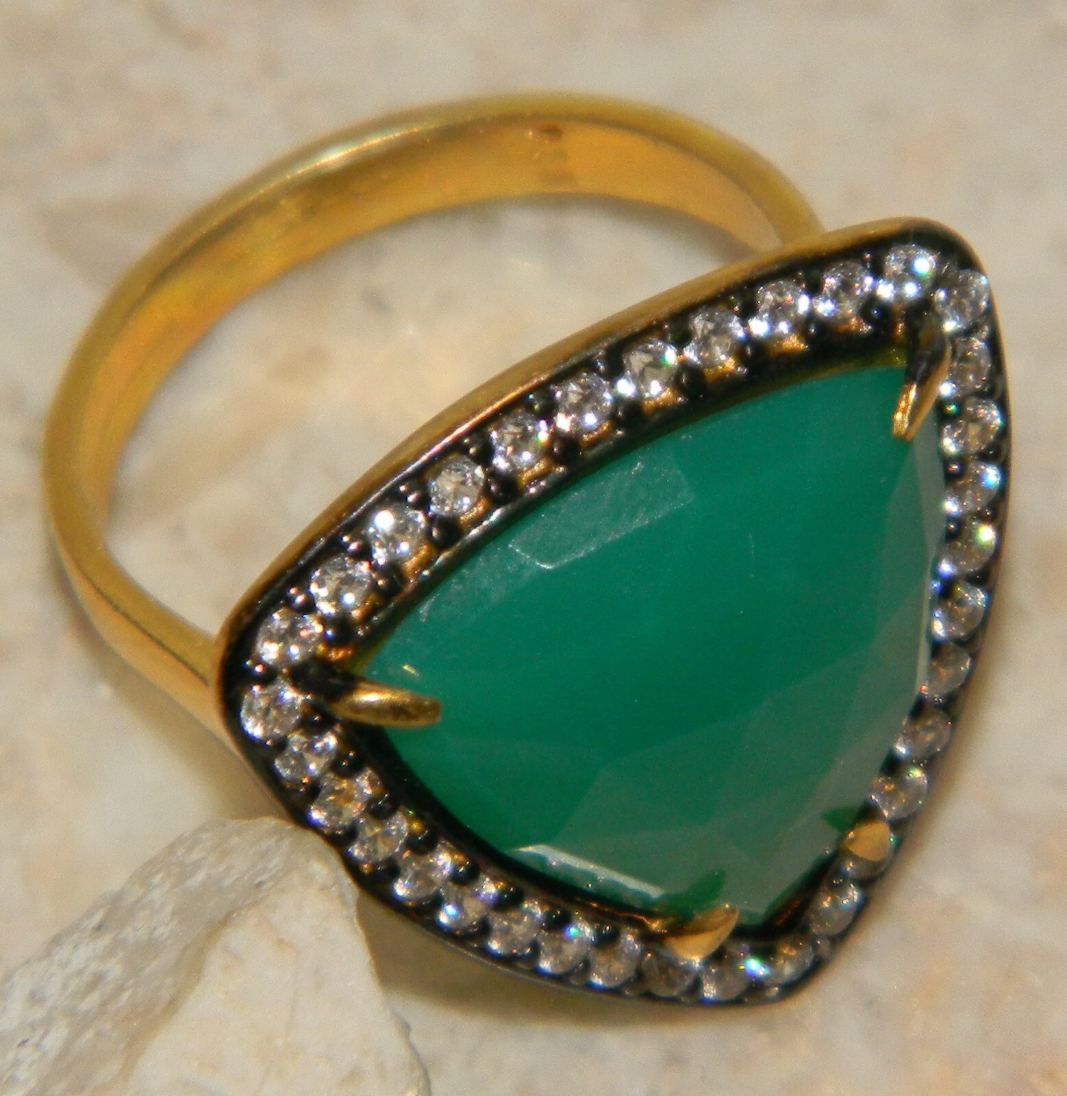 Item Type: Ring Weight: 7 g Size: 8 1/4 Material: Sterling Silver PLATED WITH GOLD Main stone: Agate Other stones: white topaz Dimension: 7/8 BY 7/8 inch Condition: New Main color: green