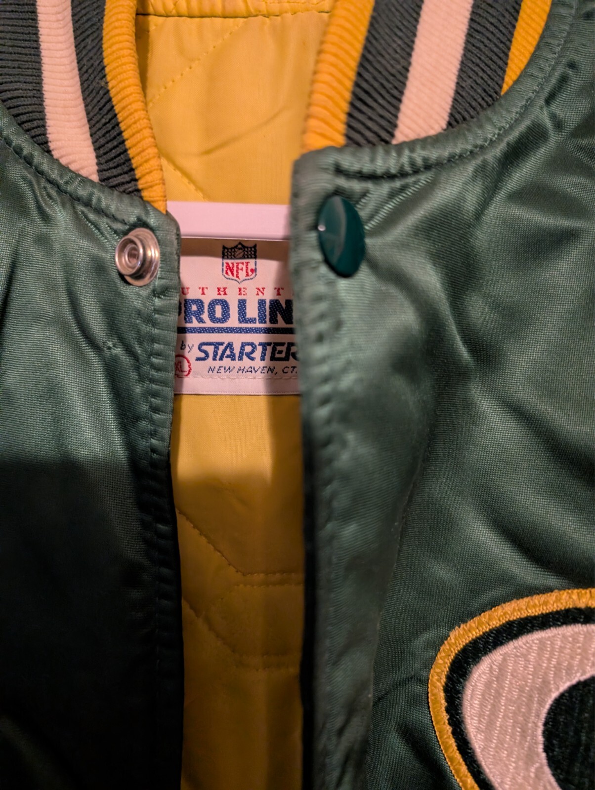 Experience the ultimate blend of style and team spirit with this Green Bay Packers satin jacket by Starter. Designed for the dedicated NFL fan, the jacket features the iconic Packers logo, ensuring you stand out in the crowd while showcasing your team pride. The size XL provides a comfortable fit for a range of body types, allowing you to enjoy the game day experience to the fullest.Crafted for durability and comfort, the jacket's high-quality satin fabric offers both warmth and a sleek look. Whether you're at the stadium or out on the town, this piece of fan apparel is a versatile addition to any Packers supporter's wardrobe. The jacket is a must-have for those chilly game days or for any time you want to keep the spirit of the team close to your heart.