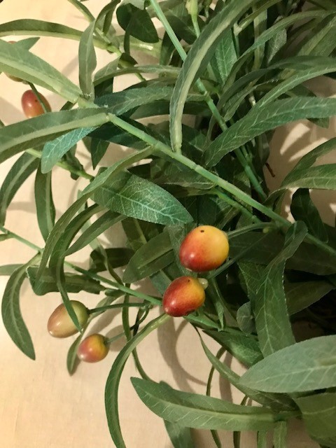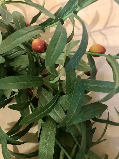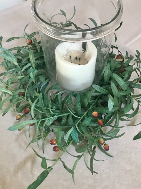 Faux Olive Branch Wreath – 20" Diameter Bring a touch of Modern Farmhouse charm to your home with this lightweight, realistic faux olive wreath. Features: Approx. 20” diameter Made with lifelike olive branches Lightweight and easy to hang Perfect for front doors, walls, or table decor Entryway, Living Room, Dining Room Uses: Door wreath Table centerpiece (pair with a candle or vase) Perfect for home staging, all-season, everyday decor Condition: Used for professional real estate staging — nearly new condition . Note: Glass hurricane & candle pictured are not included .