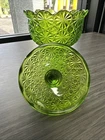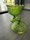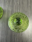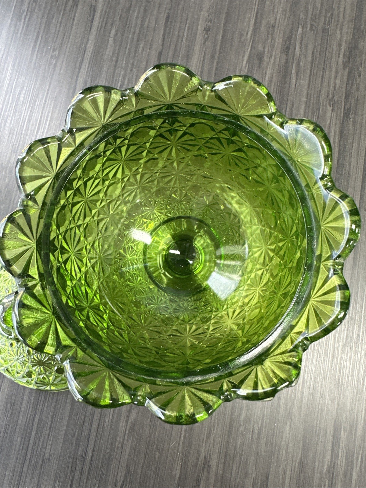 The Green Glass Candy Dish by L.E. Smith is a vintage piece with an elegant daisy and button design on a pedestal base. This round candy dish features etched patterns and a vibrant green color, adding a decorative touch to any space. Made of glass in the 1960s in the United States, this pressed glass piece is an original production that exudes a retro charm. Ideal for serving candies or as a standalone decorative item, this unique candy dish is a true vintage gem.