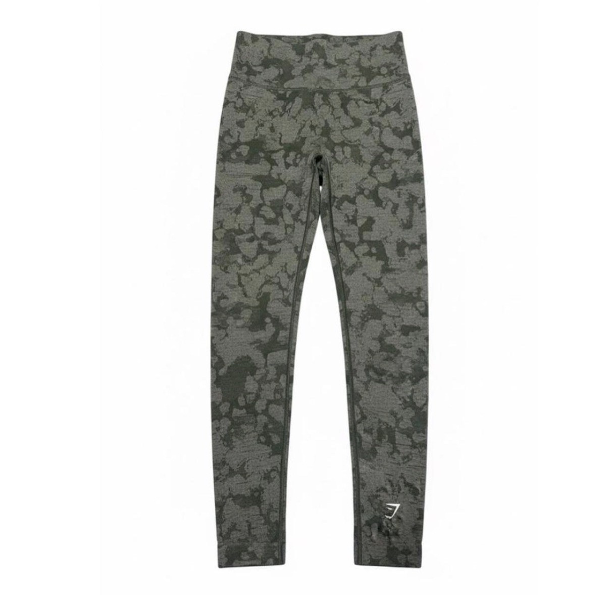 The product is a pair of women's activewear leggings from Gymshark in a size XXS. They are high-rise, full-length leggings in a stylish green camo print, designed for both comfort and performance during workouts or other active pursuits. The compression style offers a snug and supportive fit, making them ideal for various activewear occasions.
