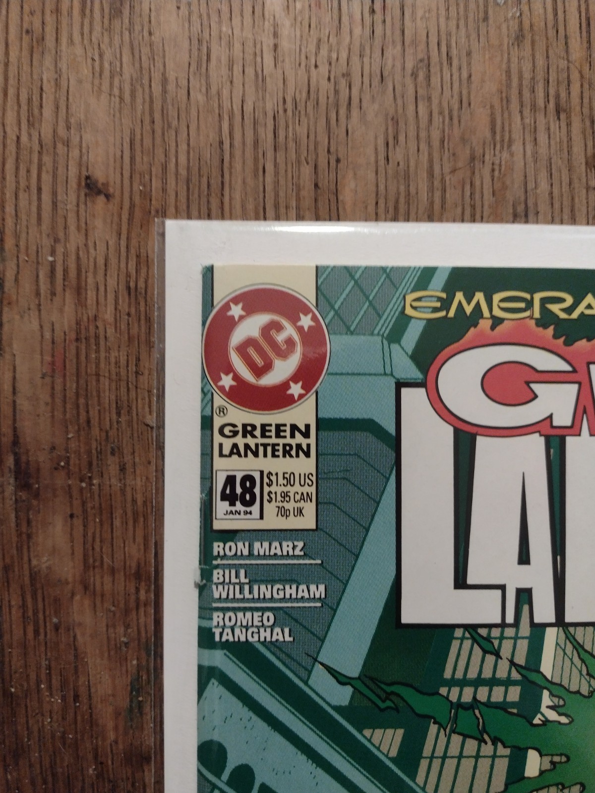 The product is a vintage comic book titled "Green Lantern 48" from 1994, which features the first appearance of Kyle Rayner as the new Green Lantern with a DC Universe Logo. Written by Ron Marz and with cover art by Darryl Banks, Anthony Tollin, and Romeo Tanghal, this single issue in color is part of the US Comics tradition and the Modern Age era of DC Comics. With a variant cover and belonging to the Superhero genre, this key issue is a must-have for collectors and fans of the Green Lantern Corps and the DC Universe.