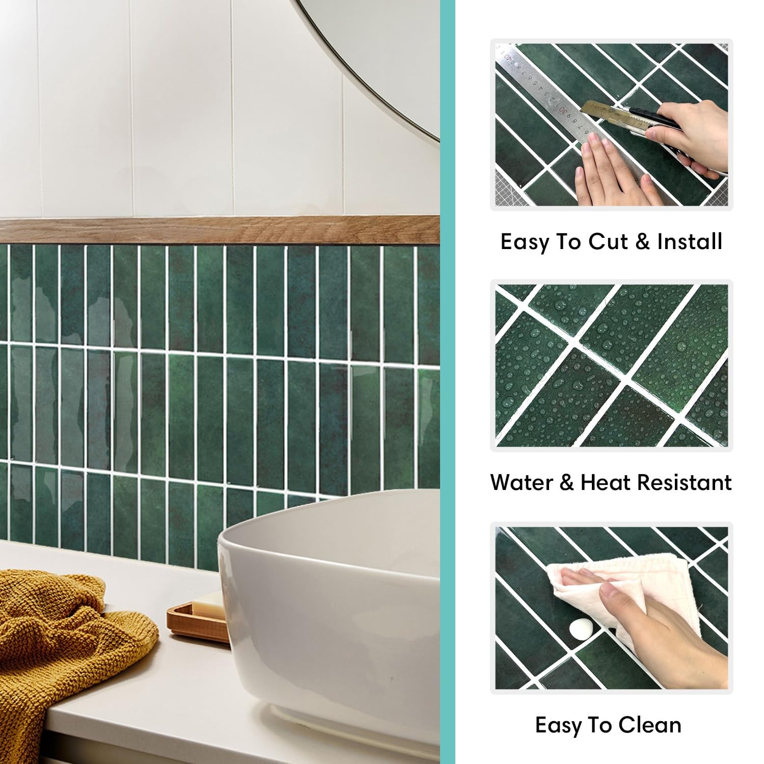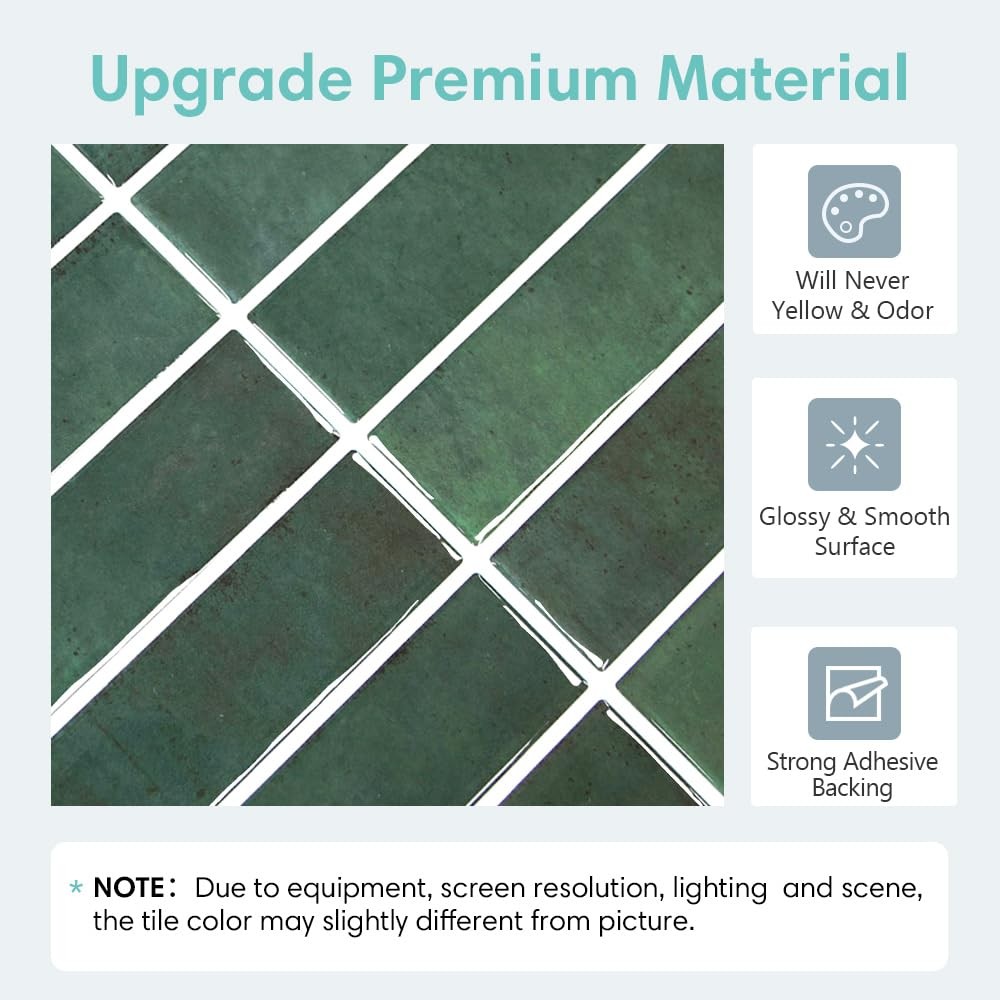 Spruce Up Your Home With Peel and Stick Wall Tile. peel and stick backsplash is a perfect choice when you want to create a remarkable space. It will highlight any place and bring a classic and stylish atmosphere. You can use it for any interior design, including kitchen, dining room, living room, bathroom, and other places. Moreover, it's very easy to install and maintain. No grout, no cement or mess, just peel and stick!Plans the layout freely to your imagination. Product Detail Product Type: Peel and Stick Tile Primary Material:Vinyl Finish: 3D Wall Tiles Surface Type: Glossy Water Resistant: Yes What’s Include:10 Sheets Peel and Pack,1 Square Feet Per Pack 12 Inches x 12 Inches x 0.1 Inches Per Sheet Easy Installation Step 1- Thoroughly clean and dry your wall. Step 2- Plan where you want to install and cut the size accordingly to better fit the wall. Step 3- Peel off the backing and stick side by side for a seamles PEEL AND STICK TILE - ORIGINAL DESIGN: We offer variety of unique and timeless vinyl backsplash choices, to make home wall decor easy, fun, and affordable! Each package of 10 sheets of tiles, covers 10 sq. ft UPGRADED PREMIUM MATERIALS, NO YELLOWING WITH TIME: green peel and stick tile are Made of Premium Vinyl, with Realistic 3D Texture and a Smooth Surface, Won't go Yellow or Crack or Odor, it stays dust-free and easy to Clean. EASY TO CUT AND INSTALL, UPGRADED STRONG ADHESIVE: Our vinyl backsplash tiles are easy to cut with scissors or a utility knife—just peel and stick.Upgraded adhesive for longer-lasting bonding. Sticking on any SMOOTH SURFACE. NOT suit for the orange peel texture wall. Press again within 48 hours after installation! DURABLE, RESISTANT TO HEAT AND WATER: Our DIY self-adhesive tiles are durable and resistant to heat from stovetops (keeping 12 inches or 30 cm away). They are also suitable as a bathroom backsplash or even around a fireplace wall decor, but not suitable for inside the shower space. WIDELY USE RANGE: 3D Stick-On Tiles for kitchen and bathroom backsplash, peel stick tile fireplace surround, wall decor living room, bedroom, laundry room, bar, hallway, feature walls, accent wall, apartment, rentals, rv, camper, etc