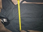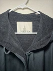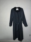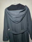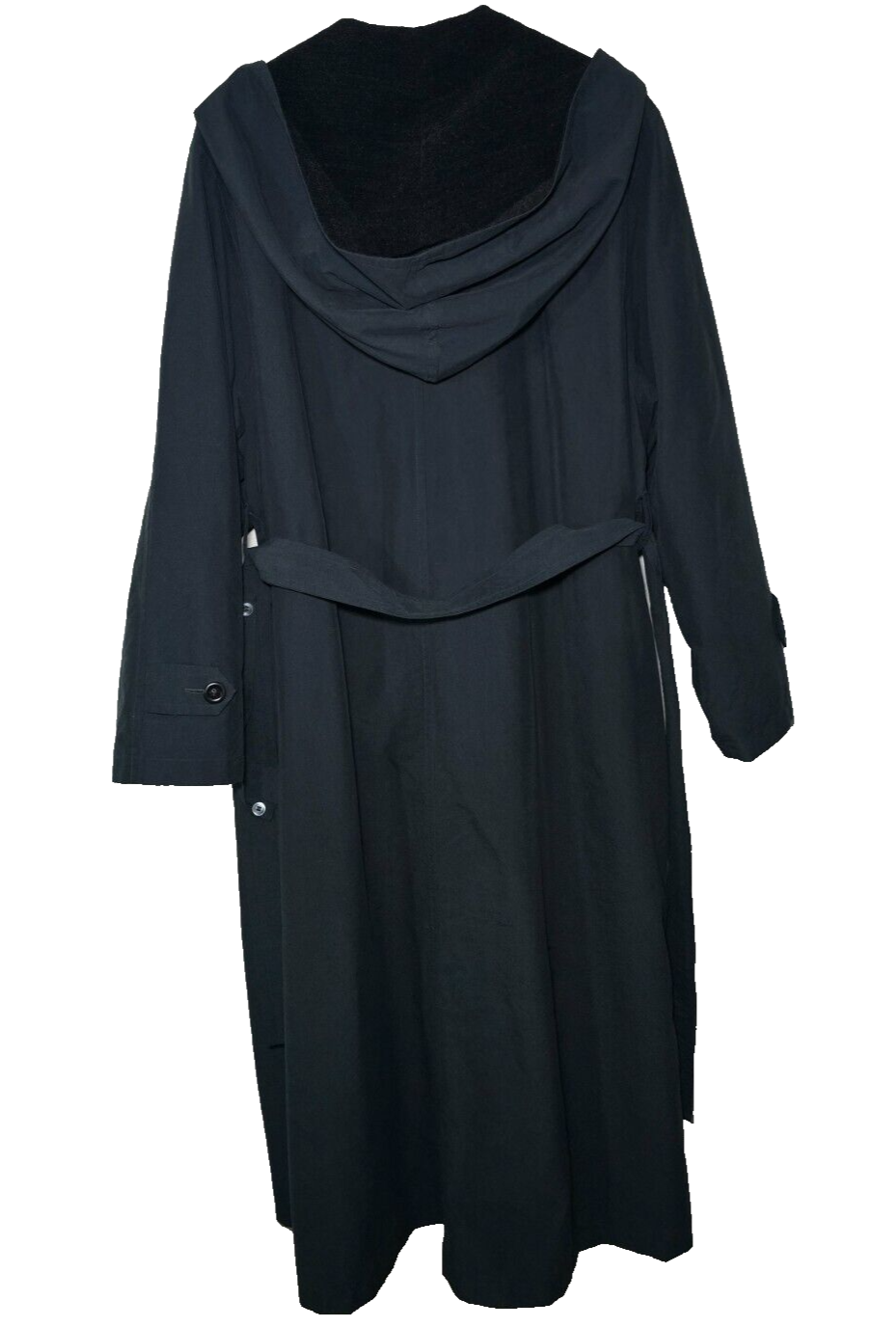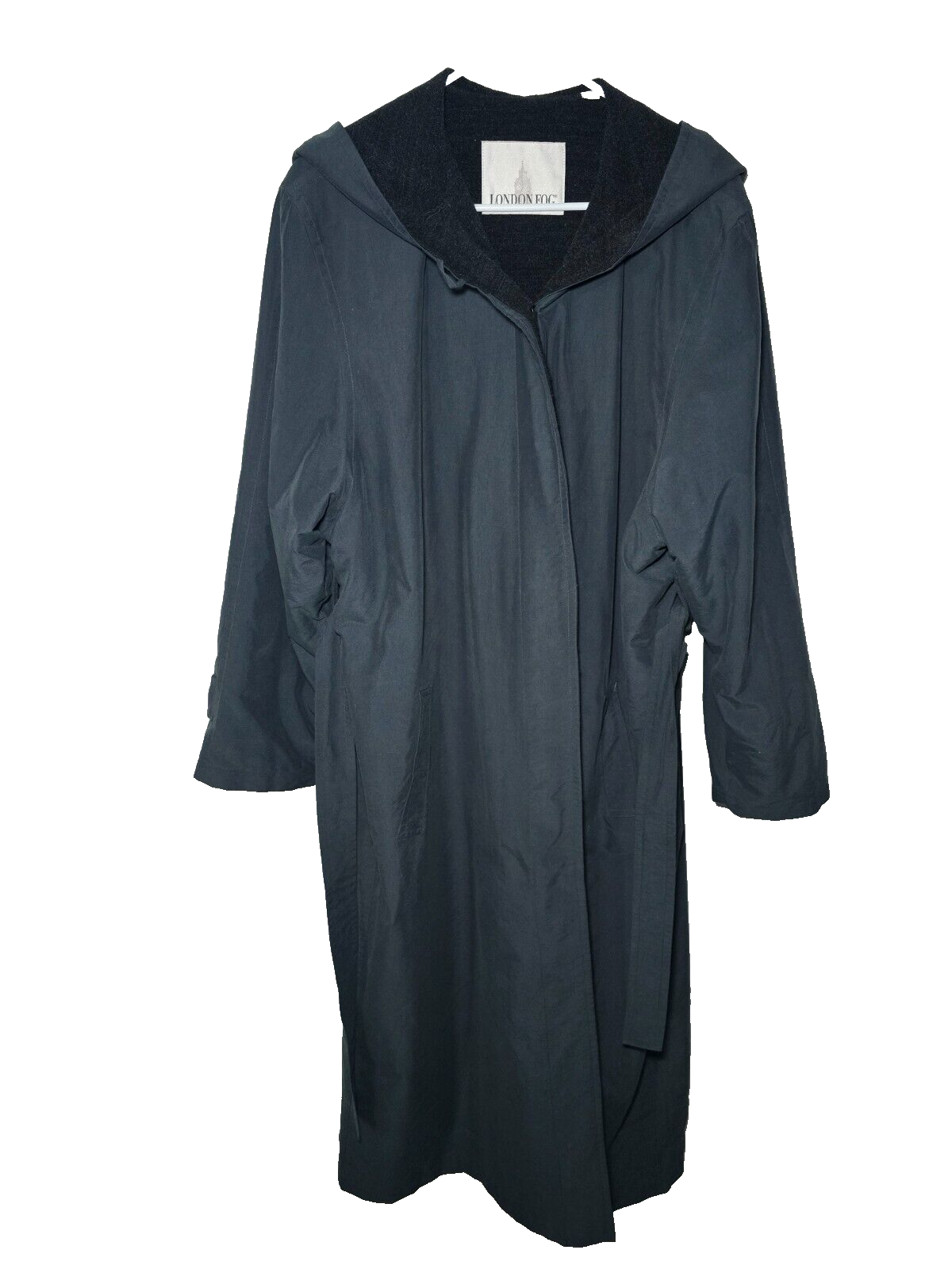 This is a stylish London Fog trench coat in green, featuring a fleece-lined oversized hood and a belted design. The coat is perfect for all seasons and is made from polycotton with a 100% cotton lining. It is designed in a regular size (L/XL) for women, with a classic trench coat style and a London theme.