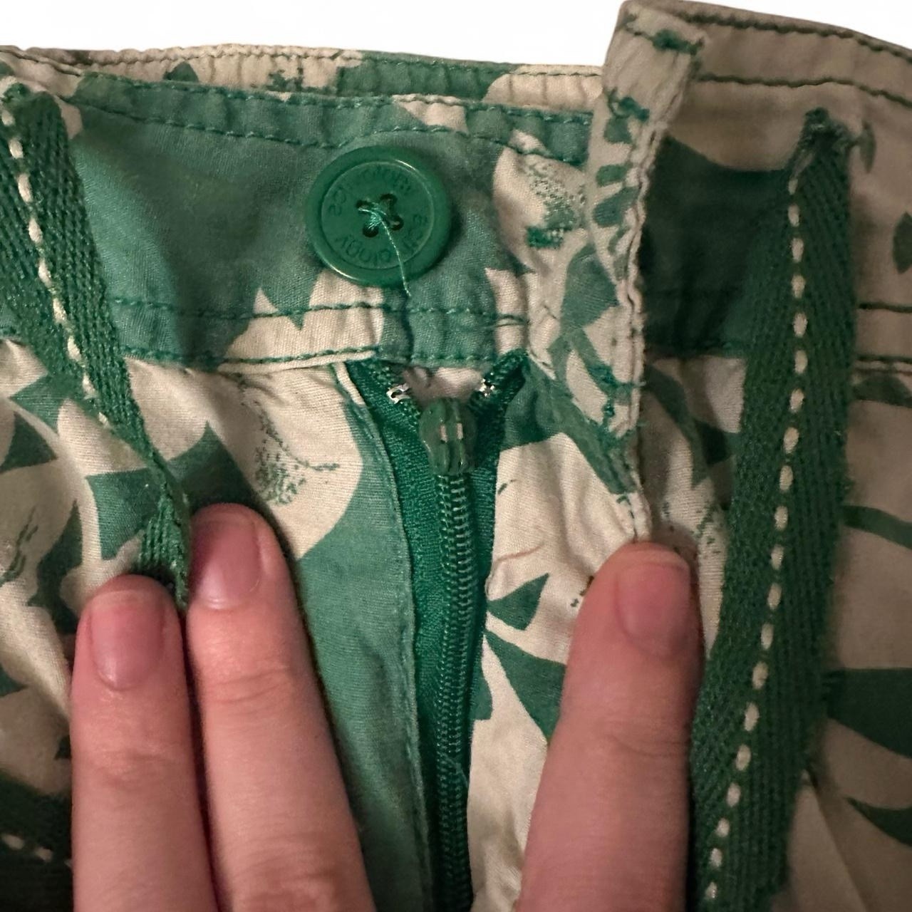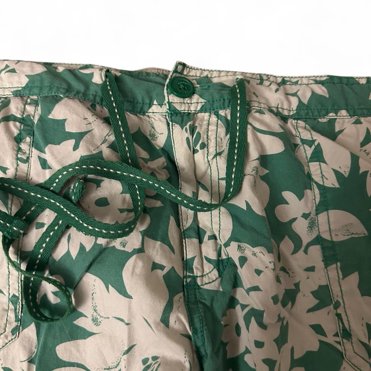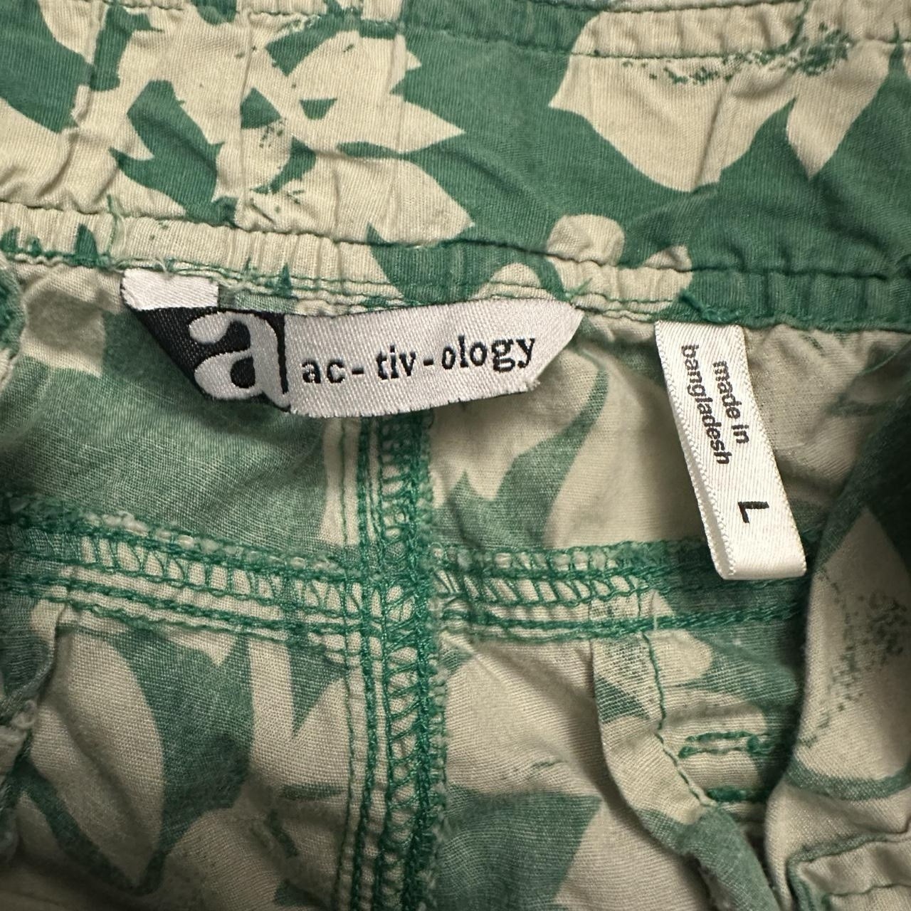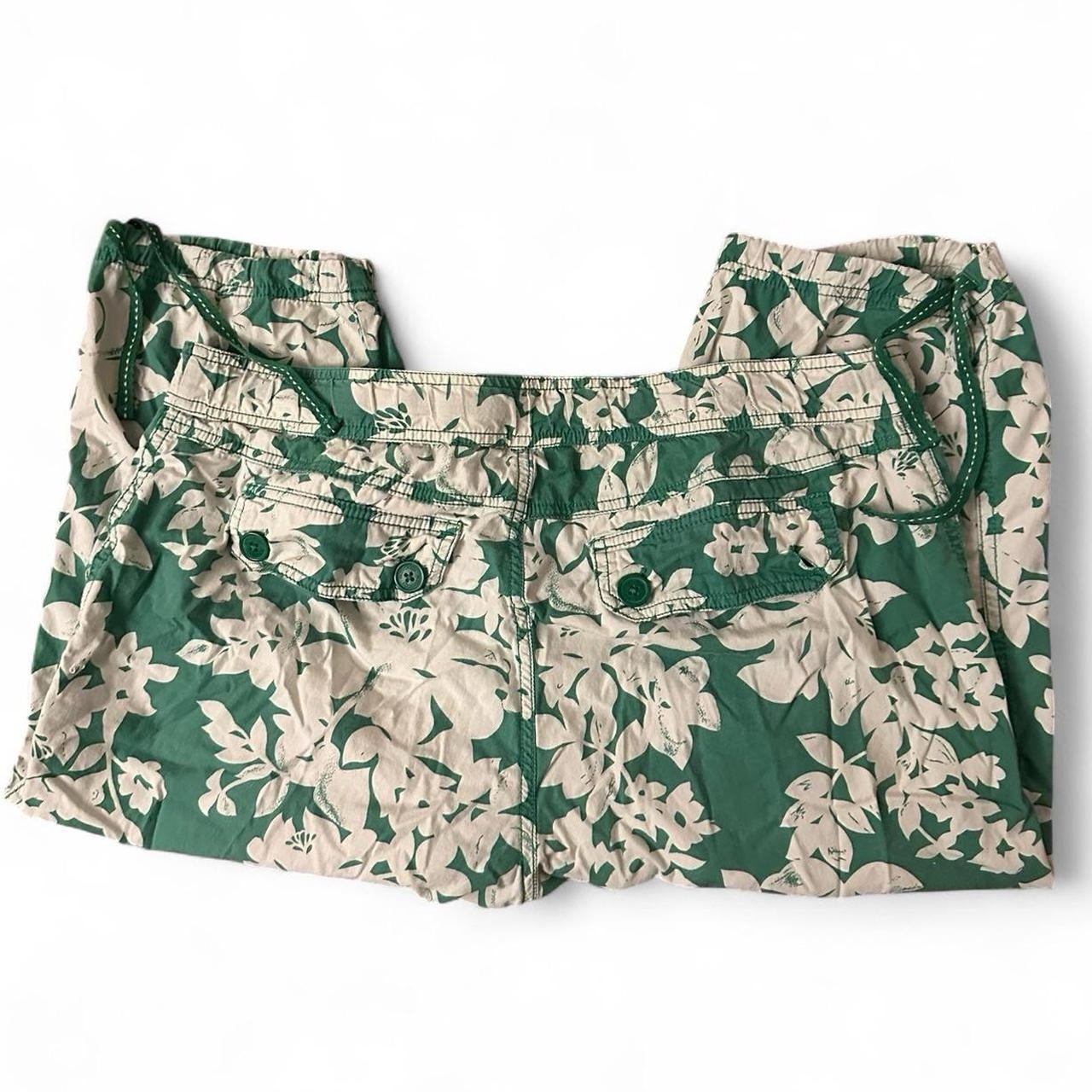 These vintage Y2K capri pants feature a unique green floral print, making them perfect for a casual summer or spring outfit. The adjustable waist and drawstring closure ensure a comfortable and personalized fit, while the machine washable fabric makes care easy. With a flat front design and a size L for women, these pants from Activology blend retro style with modern convenience, making them a standout addition to any wardrobe for those who appreciate vintage fashion. One button missing on back pocket and zipper is broken off but still fully functional!!