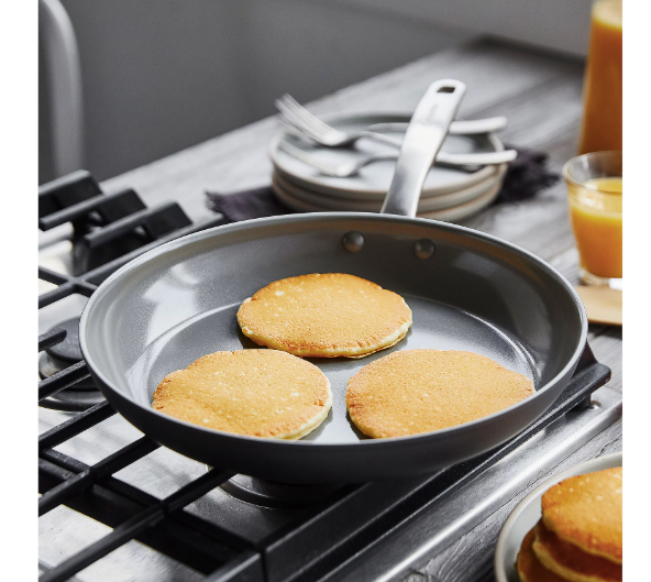 Triple your meal possibilities with this versatile set of three frying pans, each with a nonstick surface and a dishwasher-safe design for quick and easy cleanup. From GreenPan. Includes 8", 9.5", and 12" fry pans Ceramic nonstick coating Aluminum construction Dishwasher- and oven-safe to 425F Imported