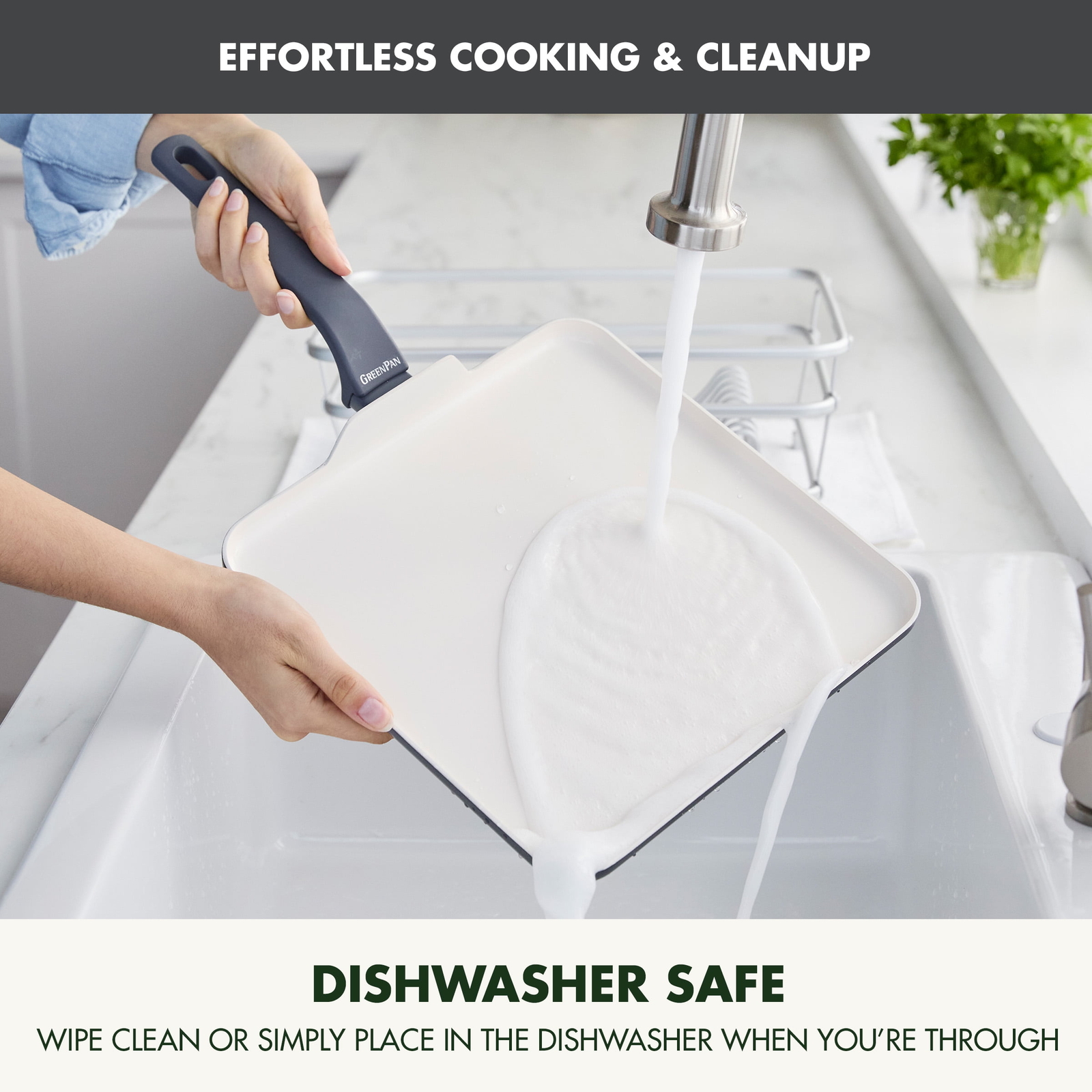 GreenPan Essence combines elegant design with thoughtful, performance-driven details. This high-performance sauté pan is packed with advanced features for effortless, toxin-free cooking and easy cleanup. Crafted in GreenPan’s state-of-the-art, environmentally conscious factory, Essence features GreenPan’s signature diamond-enhanced ceramic nonstick coating, offering exceptional durability and unbeatable food release. The quick-heating body ensures even heat distribution for consistent results when frying, searing, or sautéing. A color-matching lid and handle provide a coordinated, stylish look while enhancing functionality. Dishwasher safe for ultimate convenience, the Essence sauté pan makes healthy cooking easier and more enjoyable every day. Bring home a better way to cook—bring home GreenPan. REINFORCED WITH DIAMONDS: GreenPan's original diamond-infused nonstick coating offers remarkable durability, balanced heating, and effortless cleanup TOXIN-FREE: GreenPan's healthy ceramic nonstick adds extra durability and is for worry-free meals. QUICK-HEATING ALUMINUM: The heavy-duty construction offers strength with quick and even heating every single time. DESIGN & PERFORMANCE: This eye-catching griddle features a color-matching handle for a cohesive look that performs just as good as it looks. EFFORTLESS CLEANING: Dishwasher safe for easy cleanup, but most messes will wipe clean.