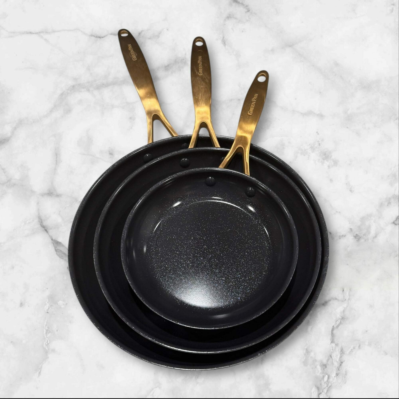 GreenPan Jewel 3-Piece Fry Pan Set Nonstick Gold Handle Excellent Surface This GreenPan Jewel 3-piece fry pan set (8.15”, 10.5”, 12.09”) features the Thermolon Infinite8 ceramic nonstick coating—diamond-reinforced for durability and toxin-free. The gold-tone handles add luxury flair, while the hard-anodized bodies offer scratch resistance and even heat. Cookware surfaces are excellent; bottoms show light wear. Oven-safe to 600°F and dishwasher-safe, this set is perfect for daily use or as a stylish kitchen upgrade.Details:•Material: Hard-anodized aluminum, ceramic nonstick, stainless steel handles•Size: 8.15”, 10.5”, 12.09”•Collection: GreenPan Jewel•What’s Included: Set of 3 fry pans•Country of Origin: Made in China•Condition: Excellent interiors, some cosmetic wear on bottoms GreenPan Jewel 3-Piece Fry Pan Set Nonstick Gold Handle Excellent Surface This GreenPan Jewel 3-piece fry pan set (8.15”, 10.5”, 12.09”) features the Thermolon Infinite8 ceramic nonstick coating—diamond-reinforced for durability and toxin-free. The gold-tone handles add luxury flair, while the hard-anodized bodies offer scratch resistance and even heat. Cookware surfaces are excellent; bottoms show light wear. Oven-safe to 600°F and dishwasher-safe, this set is perfect for daily use or as a stylish kitchen upgrade. Details: •Material: Hard-anodized aluminum, ceramic nonstick, stainless steel handles •Size: 8.15”, 10.5”, 12.09” •Collection: GreenPan Jewel •What’s Included: Set of 3 fry pans •Country of Origin: Made in China •Condition: Excellent interiors, some cosmetic wear on bottoms × × × × × × × × × Buy now and save! Shipping info Click the Shipping & Payments tab above the listing description for more info Click the Shipping & Payments tab above the listing description for more info! Additional delivery notes PICK UP OPTION Sorry, our items are NOT available for pick-up. PAYMENT Immediate payment is required upon selecting "Buy It Now" or upon checking out through the cart. We accept payment via U.S. PayPal accounts and all Major Credit Cards, Debit Cards & Google Pay. We are legally required to collect sales tax in those states and localities where we maintain a physical presence (nexus). The applicable amount of sales tax charged to an order will be calculated based on the shipment destination's state and local sales tax laws. Thank you for shopping with us on eBay! Additional Information No additional information at this time Ask seller a question You might also like Egg Wooden Serving Board - Threshold Flex Strainer Sink Strainer & Stopper 2-N-1 Fits Most 3.5” Drains & Disposals, C POURO Twist & Pour Resealable Bottle Pouring Spouts for Kitchen and Bar Pampered Chef Stoneware | Baking Bowl Contact To contact our Customer Service Team, simply click the button here and our Customer Service team will be happy to assist. Ask seller a question © Kitchen Switchen Shipping & Payments Click the Shipping & Payments tab above the listing description for more info Payment Accepted Payment Methods Immediate payment is required upon selecting "Buy It Now" or upon checking out through the cart. We accept payment via U.S. PayPal accounts and all Major Credit Cards, Debit Cards & Google Pay. We are legally required to collect sales tax in those states and localities where we maintain a physical presence (nexus). The applicable amount of sales tax charged to an order will be calculated based on the shipment destination's state and local sales tax laws. Thank you for shopping with us on eBay! Returns Returns are accepted Items must be returned within 30 days of the auction ending Buyer will pay for return shipping. eBay integration by