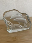 Greenbrier International Art Glass Clear Swimming Dolphins Pressed Etched Paperweight....