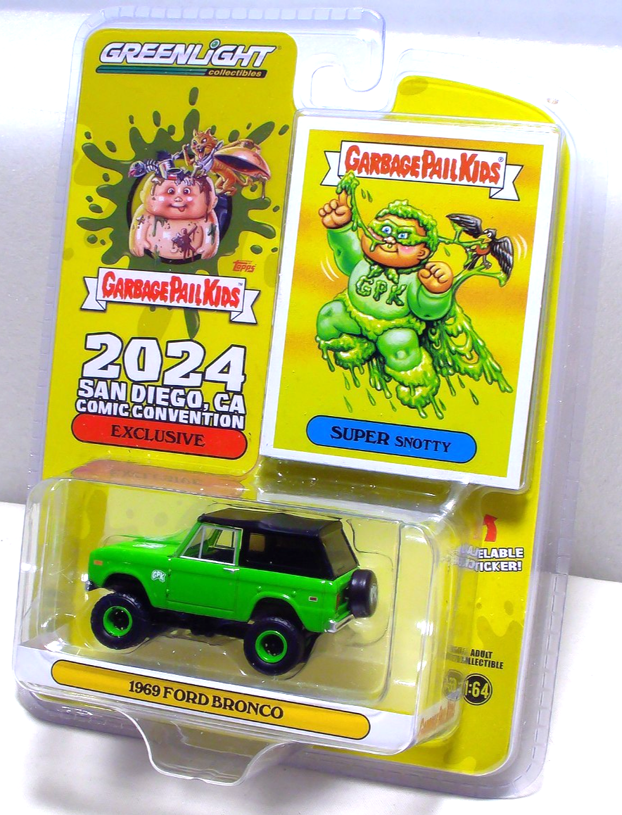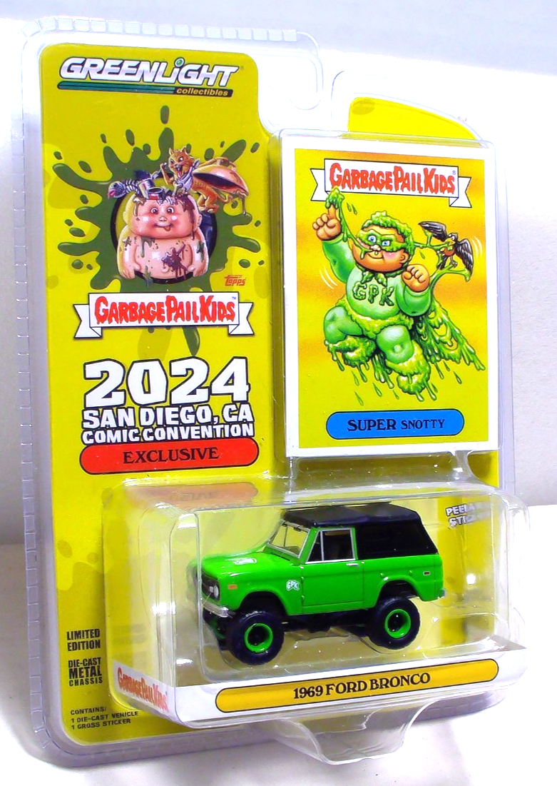 Greenlight 2024 San Diego Comic Conv Garbage Pail Kids '69 Ford Bronco 1:64 Diecast. Car is new in a sealed package. Card has light edge and corner wear, blister is intact.