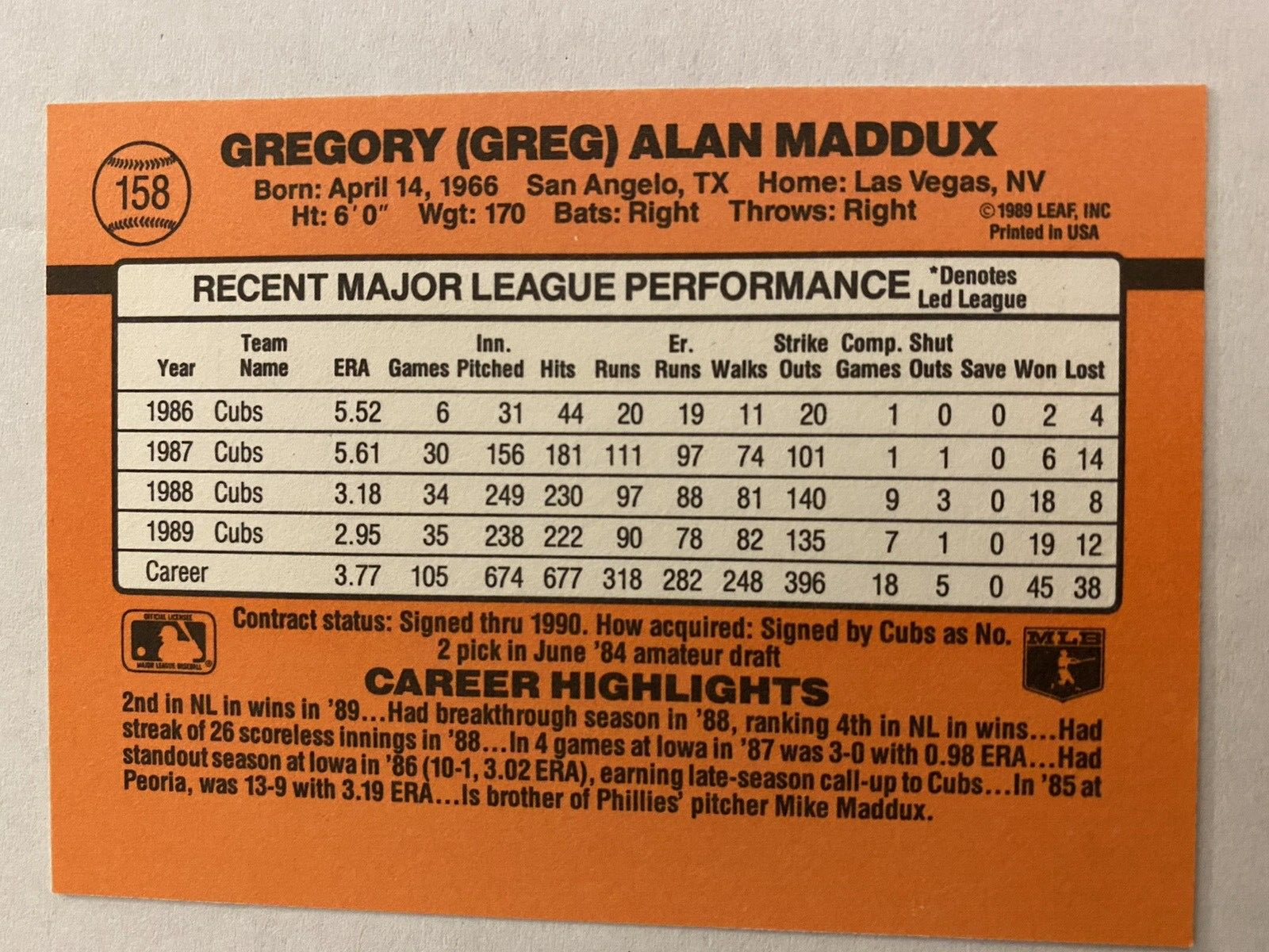 Greg Maddux 1990 Donruss #158 Chicago Cubs Error Card No Dot After Inc. Ships in penny sleeve and top loader or card saver via eBay Standard Shipping. Buyer can choose to have shipped in bubble mailer with tracking via USPS Ground Advantage in penny sleeve, top loader and protected by cardboard for a set fee for shipping and handling.