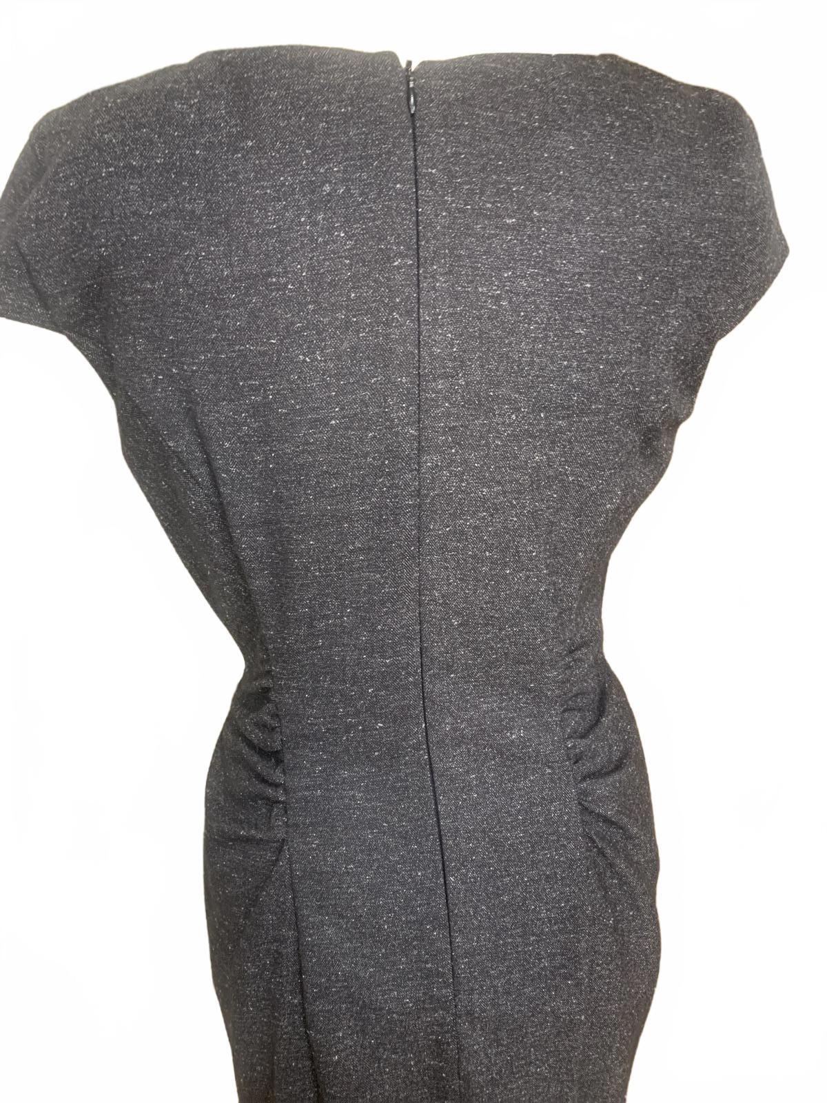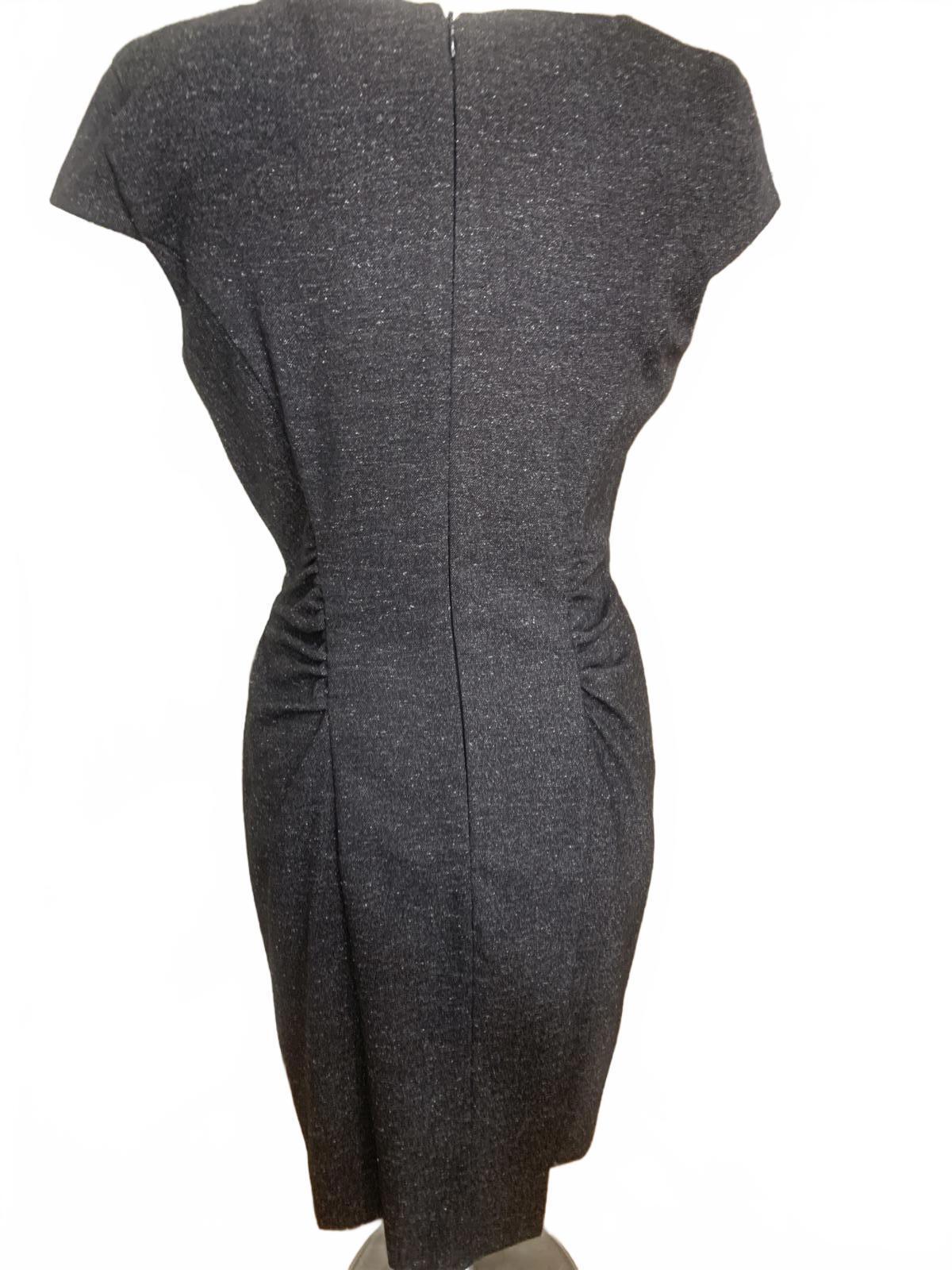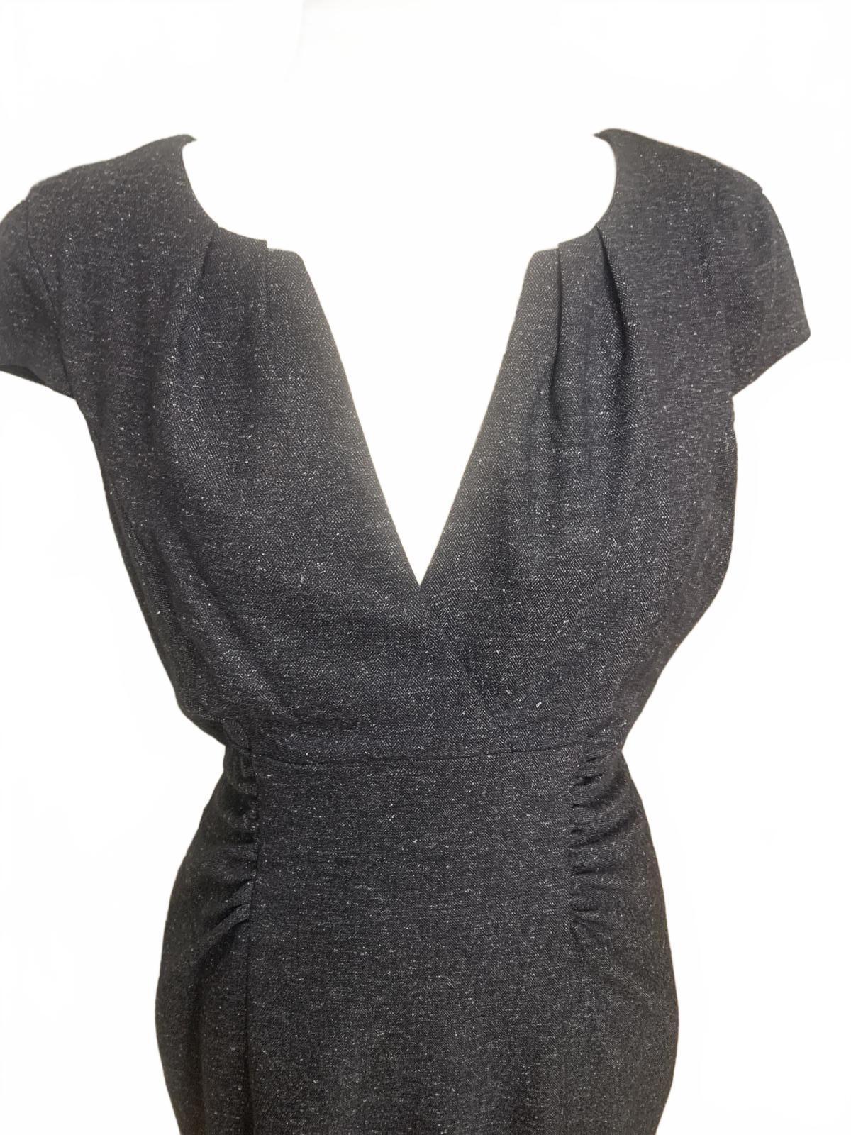 Fitted sheath with ruching at waistline. Wrap v-neck. Retro vibe. Cap sleeves lined bodice back zipper, Ptp 20” Waist flat 15” Shoulder to hem 39” Sleeve 3.75” 61% polyester 35% rayon 4% spandex Wash cold