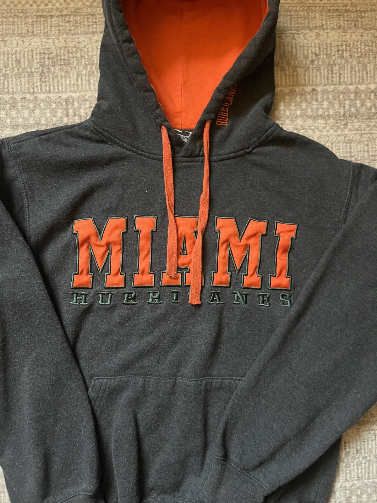 The product is a grey and orange Miami Hurricanes college hoodie with a Stadium athletics brand. It is a size small and features the Miami Hurricanes team colors. Perfect for fans of the football team, this sweatshirt is a stylish way to show support for the Miami Hurricanes.