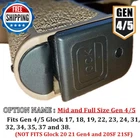 Grip Frame Insert Plug for Gen 1-5 Glock 17 18 19 20 21 22 23 24 25 31 32 34 35 43X 48 Fits Mid and full size Generation 4/5 Models 17, 18, 19, 22, 23, 24, 31, 32, 34, 35, 37 ,38,44(NOT FITS Models 20 21 Gen4 and 20SF 21SF). Note: You can not use the additional backstraps when the plug is installed. Protects your pistols internal parts from dust/ dirt/Debris/ rain/ snow/ lint etc. Engineered for speed, beveled for fast reloads. Aid in guiding the magazine fast into the magazine well. Flush fit to eliminate the possibility of snagging on the open cavity. Use safety packaging to prevent being crushed by heavy objects during transportation. Part Number Glock-Plug Material Plastic, Acrylic Grip Type Mid and Full Size Gen 4/5 Package Weight 0.01 Kilograms Item Package Dimensions L x W x H 3.98 x 3.27 x 0.55 inches Shipping Fast shipping is very important for us. Our standard US shipping service is FREE. Your order will be shipped within 2-3 business days upon full payment received. Your order will be delivered within 2-3 business days after the handling time. We only ship to the confirmed PayPal address. We reserve the right to cancel any order for any reason at any time. We are not responsible for undeliverable addresses. Returns and payment We offer a 30 days return policy from checkout winning date. We allow only PayPal as payment method FeedBack Your feedback very important to us, after you get your package and you are satisfied with our service please leave us positive feedback If you have any problem with your order / any questions please before leave any type of feedback Please visit our eBay store to check out other items for sale! Thank you for shopping at our store.