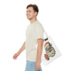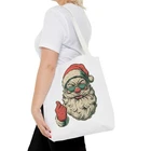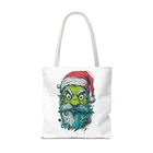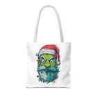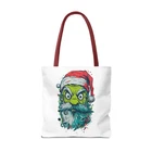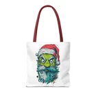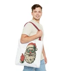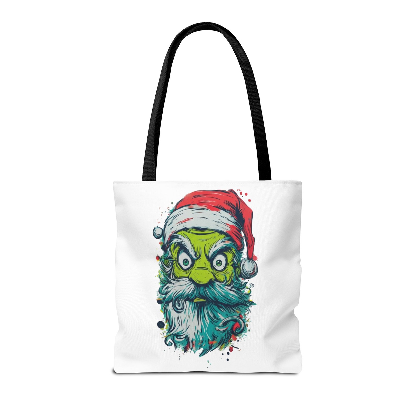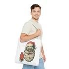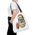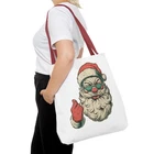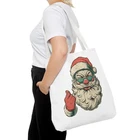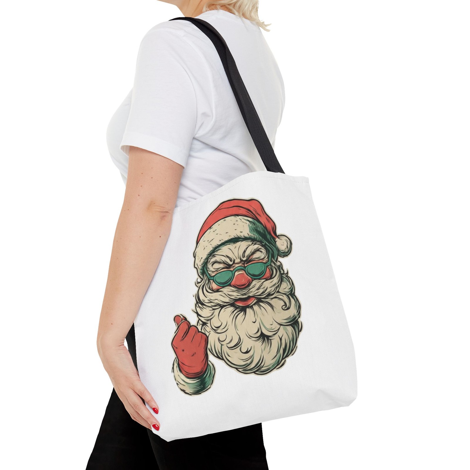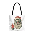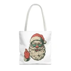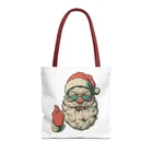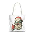 Carry a little holiday mischief everywhere you go. This sturdy tote pairs a roomy, boxed-corner silhouette with playful, slightly rebellious Santa artwork — the kind that sparks smiles on the sidewalk and starts conversations at the market. The durable polyester body keeps the print bright and the bag shape true, while reinforced handle stitching and a laminated interior make it ready for daily errands, gifts, or festive outings. Choose a handle color to match your mood and pick the size that fits your life. It feels casual, a bit cheeky, and wholly seasonal — the kind of bag you reach for when you want function with personality. Product features - 100% polyester medium-weight body (6.49 oz/yd²) — durable and quick-drying - Reinforced double-row stitching on handles for added strength - Boxed corners for extra interior space and better load distribution - Non-woven laminate interior with cotton handles; 3 sizes available - Seamless/black stitching options and 5 handle color choices; size tolerance ±0.75" Care instructions - Remove all items from the bag before cleaning. Suggested to pretreat visible stains with stain remover. Mix warm water with laundry detergent and clean the bag with terry washcloth or a soft bristle brush. Let the bag air dry.