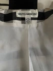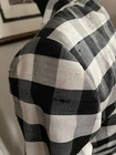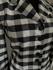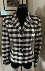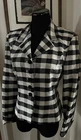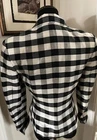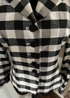 Sensational jacket in dupioni silk checks in black and white. Black buttons, slightly fitted waist and small shoulder pads. Sleeves have splits at the ends so you can wear them straight or turned up in to cuffs. Marked size 4. Lined in acetate. So useful for day or evening all year. Measures 22 long and sleeves 23 1/2, shoulder to shoulder seams upper back almost 16. Across the chest in front when buttoned, at underarm level 17 1/2, waist in front 15 and at the bottom in front 17. Made in USA.