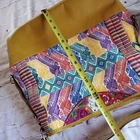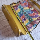 This vibrant tote bag features a colorful pattern with a mustard yellow base. The embroidery is handmade in Guatemala. The base, trim and handle is leather. It's line with multicolor textile. It has 3 interiors pockets. Snap closure. It's new without tags. Please see pictures for details and let me know if you have any questions I ship the next business day