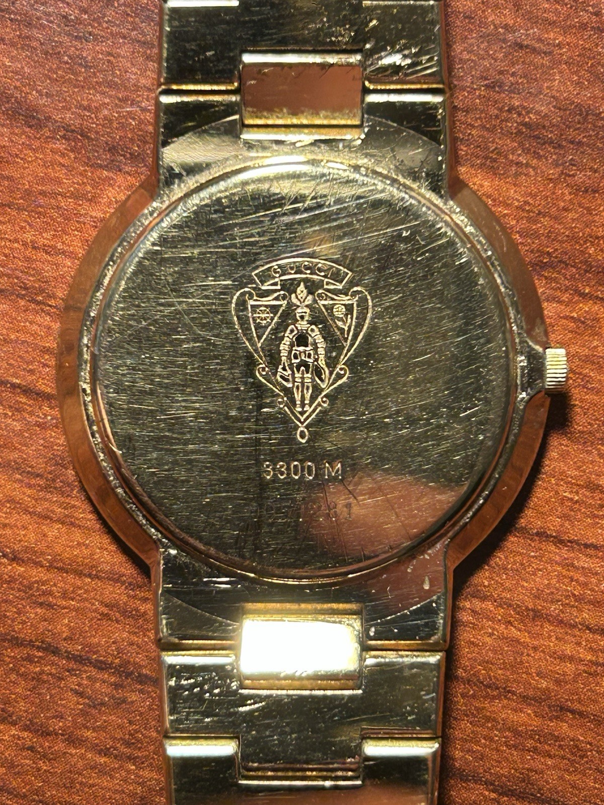 Elevate your accessory game with this stunning Gucci watch, featuring a sleek design that combines luxury with versatility. The gold-tone metal bracelet is beautifully embellished with intricate detailing, while the bold black dial adds sophistication. Whether you're dressing up for an occasion or looking for a chic everyday piece, this watch is perfect for any ensemble. Ideal for collectors or those looking to own a stylish luxury timepiece. - Brand: Gucci - Condition: Very Good - Light scratches on backing. See pictures for more details - Elegant gold-tone metal - Striking black dial - Versatile for any occasion - New, jeweler installed battery