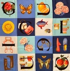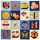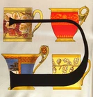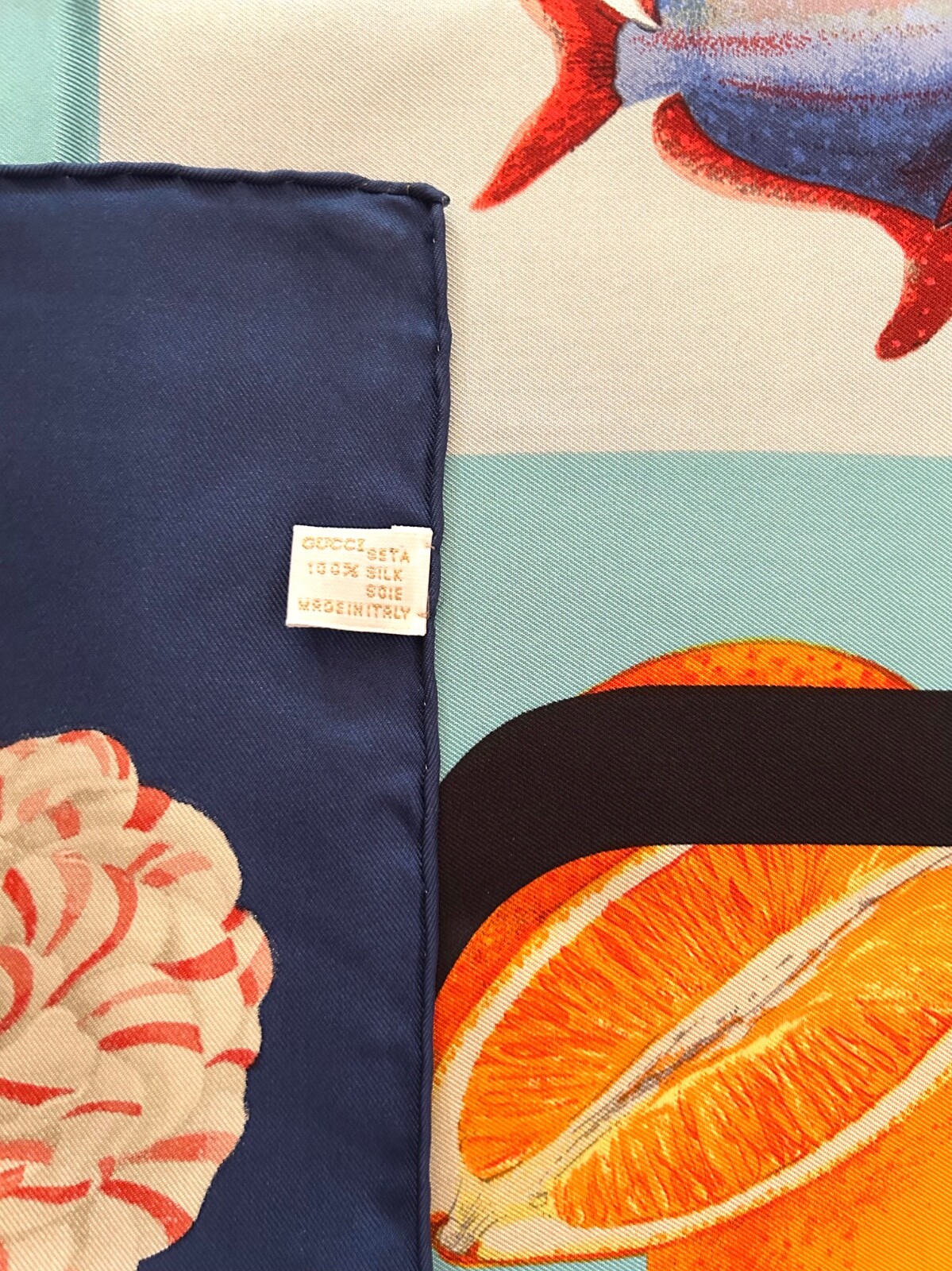Iconic Gucci Italian silk scarf spells out “GUCCI” within a colorful sixteen-square vignette of Gucci loafers, bags, boots and teacups, butterflies, camellias, dahlias, apples and oranges. Care tag attached. Mint condition. Insured economy shipping within the United States. eBay international shipping to all other countries.