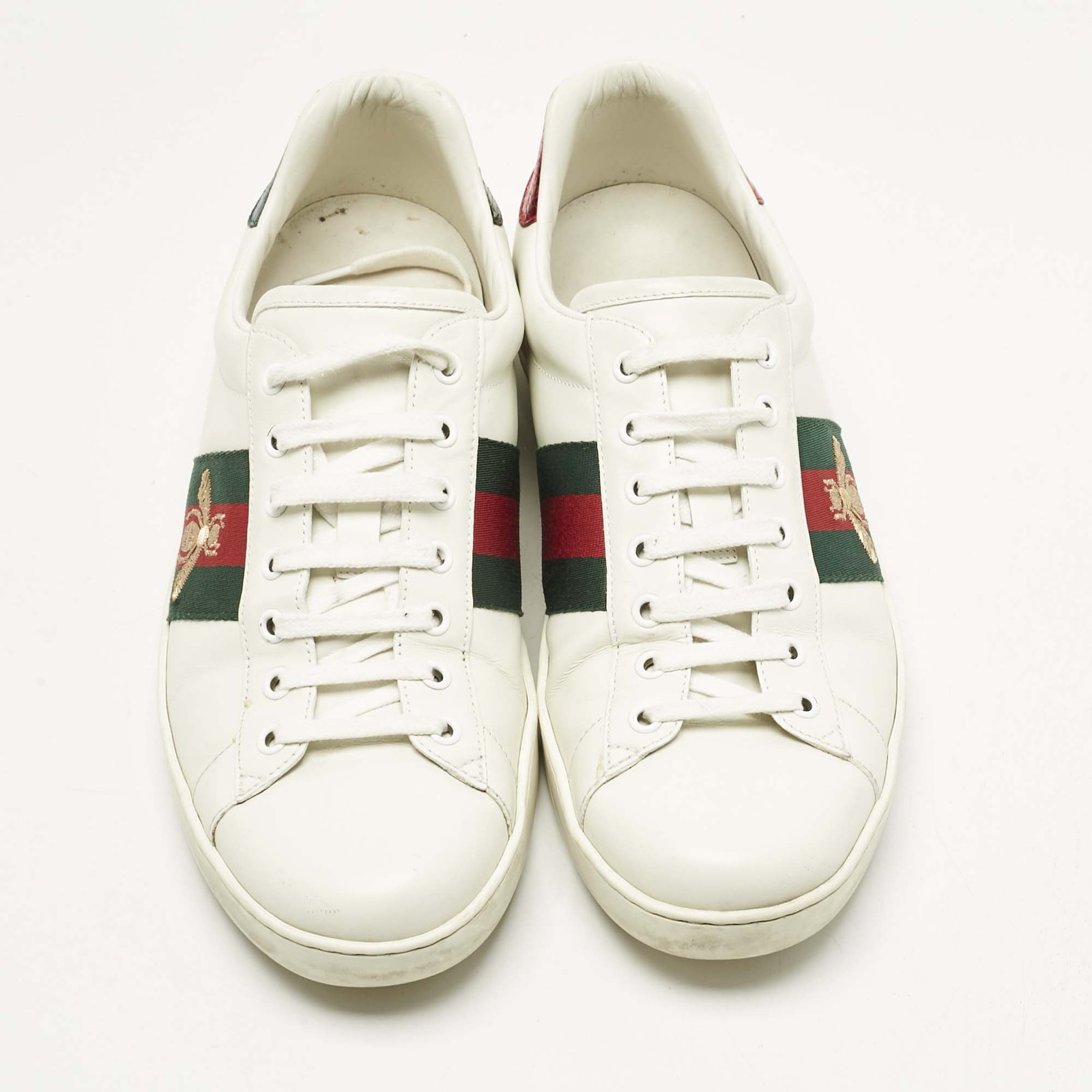 Classic tennis inspired design meets signature Italian flair. These white low tops are elevated with embroidered bees and subtle Web, Gucci’s timeless symbols of heritage and charm.Certified by The Luxury Closet - This item has gone through a detailed authentication process overseen by our experts. We offer a lifetime guarantee of authenticity on all our items. Import duties, taxes and charges are not included in the item price. These charges are the buyers responsibility. Please check with your country’s customs office to determine what these additional cost will be prior to buying. Our eBay Store About Us Contact Us Add to Favorite Sellers Gucci White Leather Bee Embroidered Ace Low Top Sneakers Size 44 $277.2 Classic tennis inspired design meets signature Italian flair. These white low tops are elevated with embroidered bees and subtle Web, Gucci’s timeless symbols of heritage and charm. Product Details Brand Color White Dimensions Material Leather Size 44 Outsole Width Outsole Length Heel Height Includes Certified by The Luxury Closet This item has gone through a detailed authentication process overseen by our experts. We offer a lifetime guarantee of authenticity on all our items. How We Check The in-house team of experts at The Luxury Closet is highly trained to verify the authenticity and the condition of the luxury products. They ensure that only 100% authentic items are put on sale.The evaluation process is unique with its own mix of assessment criteria and differs according to the category. Each item is evaluated based on the following combination of hallmarks, hardware, stitching, symmetry, material, craftsmanship, stamping, codes, hologram stickers, and packaging. Our authenticators also check if the items have been modified or amended (e.g., aftermarket diamonds, replaced batteries, repaired bags, etc.) International Buyers Import duties, taxes and charges are not included in the item price. These charges are the buyers responsibility. Please check with your country’s customs office to determine what these additional cost will be prior to buying.