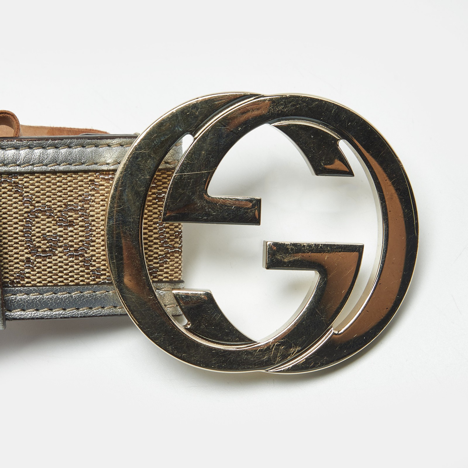 Light up your belt collection with this belt from Gucci. Made from GG canvas and leather trims, it features the iconic interlocking G buckle in metal, accompanied by a single loop. This belt will look ideal with casuals.Certified by The Luxury Closet - This item has gone through a detailed authentication process overseen by our experts. We offer a lifetime guarantee of authenticity on all our items. Import duties, taxes and charges are not included in the item price. These charges are the buyers responsibility. Please check with your country’s customs office to determine what these additional cost will be prior to buying. Our eBay Store About Us Contact Us Add to Favorite Sellers Gucci Beige/Silver GG Canvas and Leather Interlocking G Buckle Belt 90CM $407 Light up your belt collection with this belt from Gucci. Made from GG canvas and leather trims, it features the iconic interlocking G buckle in metal, accompanied by a single loop. This belt will look ideal with casuals. Product Details Brand Color Beige Dimensions Material Canvas, Leather Size 90CM Outsole Width Outsole Length Heel Height Includes Certified by The Luxury Closet This item has gone through a detailed authentication process overseen by our experts. We offer a lifetime guarantee of authenticity on all our items. How We Check The in-house team of experts at The Luxury Closet is highly trained to verify the authenticity and the condition of the luxury products. They ensure that only 100% authentic items are put on sale.The evaluation process is unique with its own mix of assessment criteria and differs according to the category. Each item is evaluated based on the following combination of hallmarks, hardware, stitching, symmetry, material, craftsmanship, stamping, codes, hologram stickers, and packaging. Our authenticators also check if the items have been modified or amended (e.g., aftermarket diamonds, replaced batteries, repaired bags, etc.) International Buyers Import duties, taxes and charges are not included in the item price. These charges are the buyers responsibility. Please check with your country’s customs office to determine what these additional cost will be prior to buying.