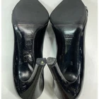 These Gucci heels feature a sleek black design with a glossy patent leather toe cap, offering a sophisticated and polished look. The elegant silhouette is complemented by a subtle decorative detail, making them perfect for formal occasions. Crafted with attention to detail, these heels are a timeless addition to any wardrobe.