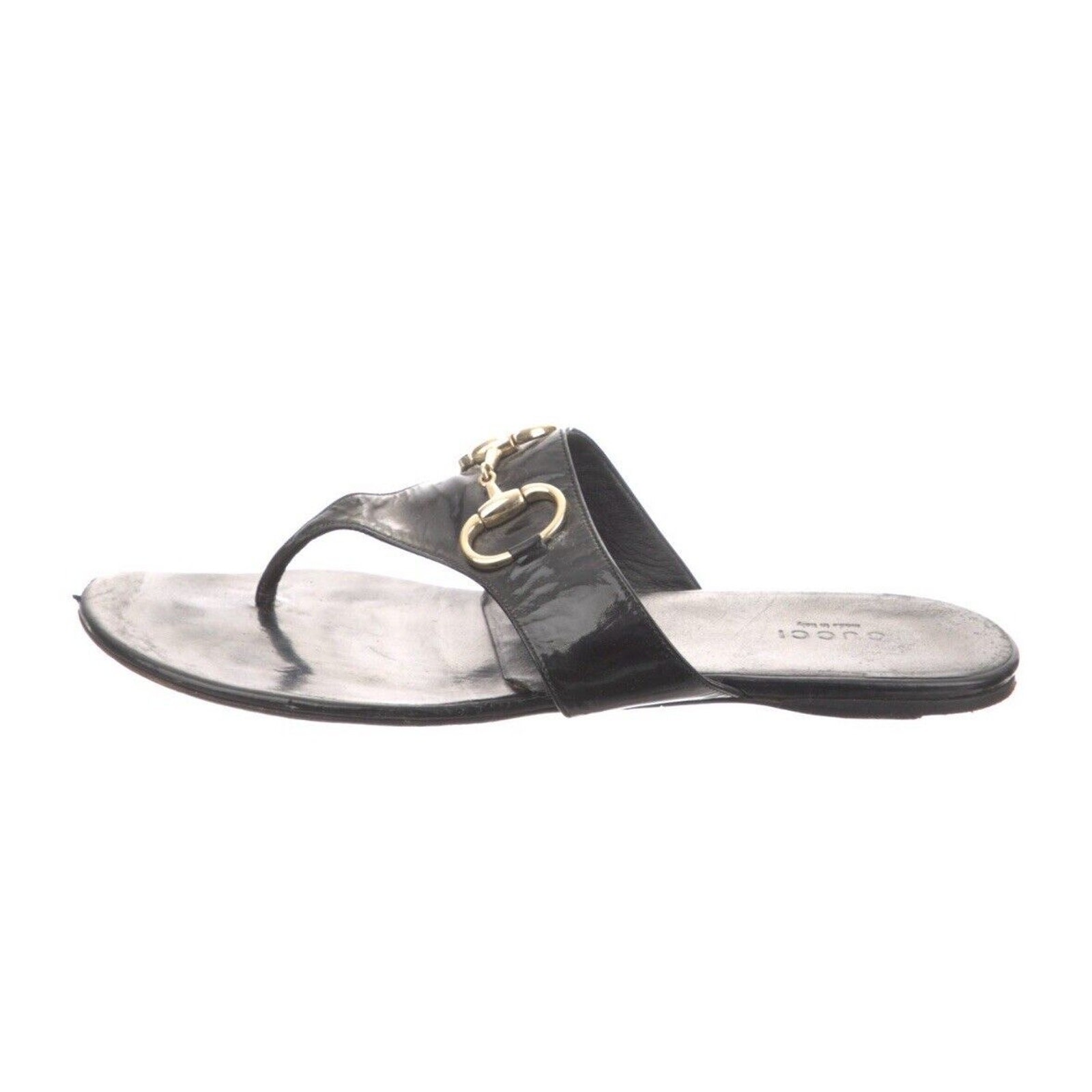 Add a touch of elegance to your summer wardrobe with these authentic Gucci black patent leather thong sandals. With a silver horsebit closure, these slip-on sandals are perfect for any woman who wants to make a statement. The shiny patent leather upper material reflects the sun's rays, making these sandals perfect for any outdoor occasion. These sandals are available in US shoe size 7 and are ideal for any woman who loves the Gucci brand.