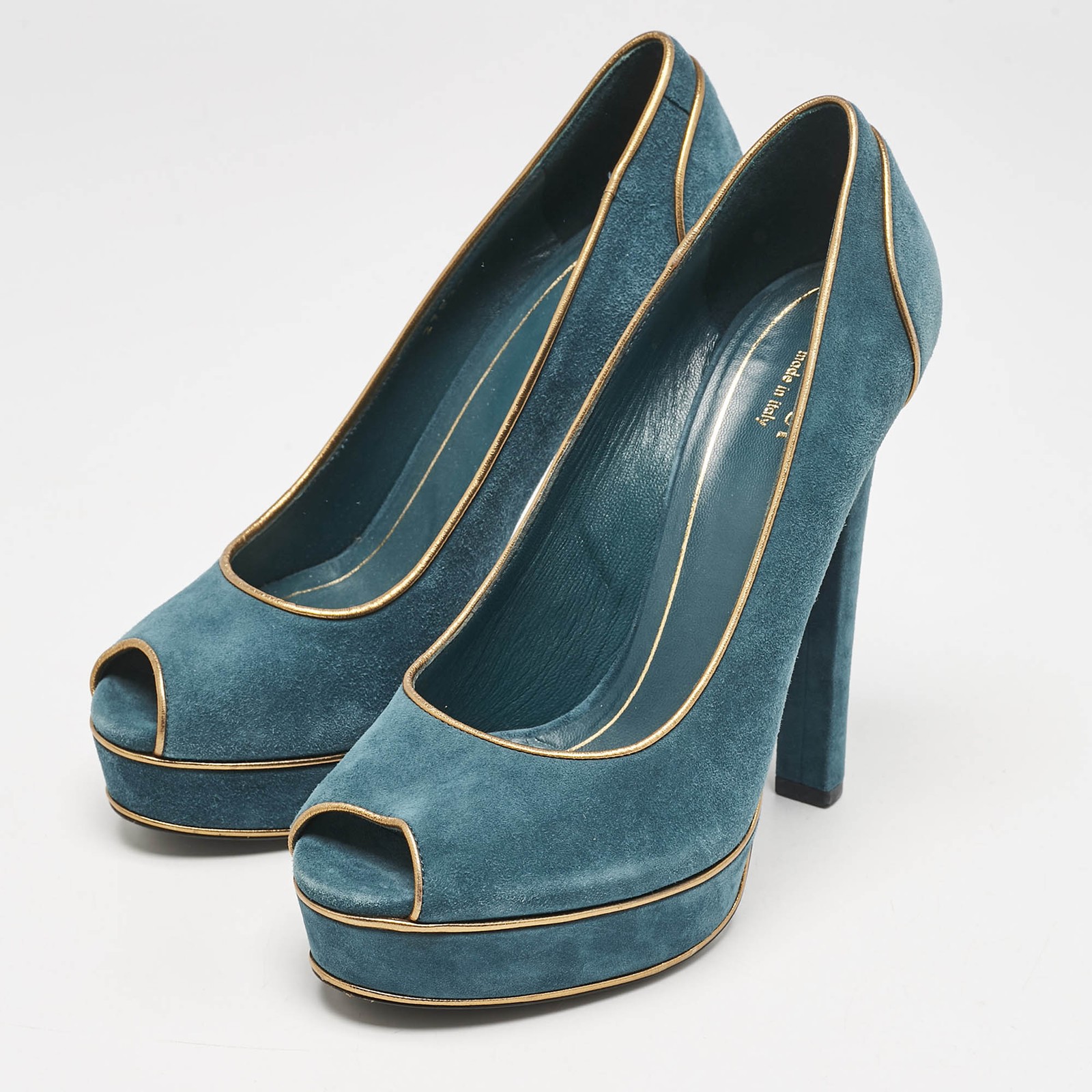 An elegant blend of textures, these Gucci pumps mix metallic gold with deep blue suede—perfect for elevating evening looks with ease.Certified by The Luxury Closet - This item has gone through a detailed authentication process overseen by our experts. We offer a lifetime guarantee of authenticity on all our items. Import duties, taxes and charges are not included in the item price. These charges are the buyers responsibility. Please check with your country’s customs office to determine what these additional cost will be prior to buying. Our eBay Store About Us Contact Us Add to Favorite Sellers Gucci BlueGold Leather and Suede Peep Toe Pumps Size 39 $407 An elegant blend of textures, these Gucci pumps mix metallic gold with deep blue suede—perfect for elevating evening looks with ease. Product Details Brand Color Blue Dimensions Material Leather, Suede Size 39 Outsole Width Outsole Length Heel Height Includes Certified by The Luxury Closet This item has gone through a detailed authentication process overseen by our experts. We offer a lifetime guarantee of authenticity on all our items. How We Check The in-house team of experts at The Luxury Closet is highly trained to verify the authenticity and the condition of the luxury products. They ensure that only 100% authentic items are put on sale.The evaluation process is unique with its own mix of assessment criteria and differs according to the category. Each item is evaluated based on the following combination of hallmarks, hardware, stitching, symmetry, material, craftsmanship, stamping, codes, hologram stickers, and packaging. Our authenticators also check if the items have been modified or amended (e.g., aftermarket diamonds, replaced batteries, repaired bags, etc.) International Buyers Import duties, taxes and charges are not included in the item price. These charges are the buyers responsibility. Please check with your country’s customs office to determine what these additional cost will be prior to buying.