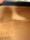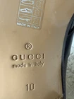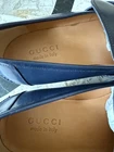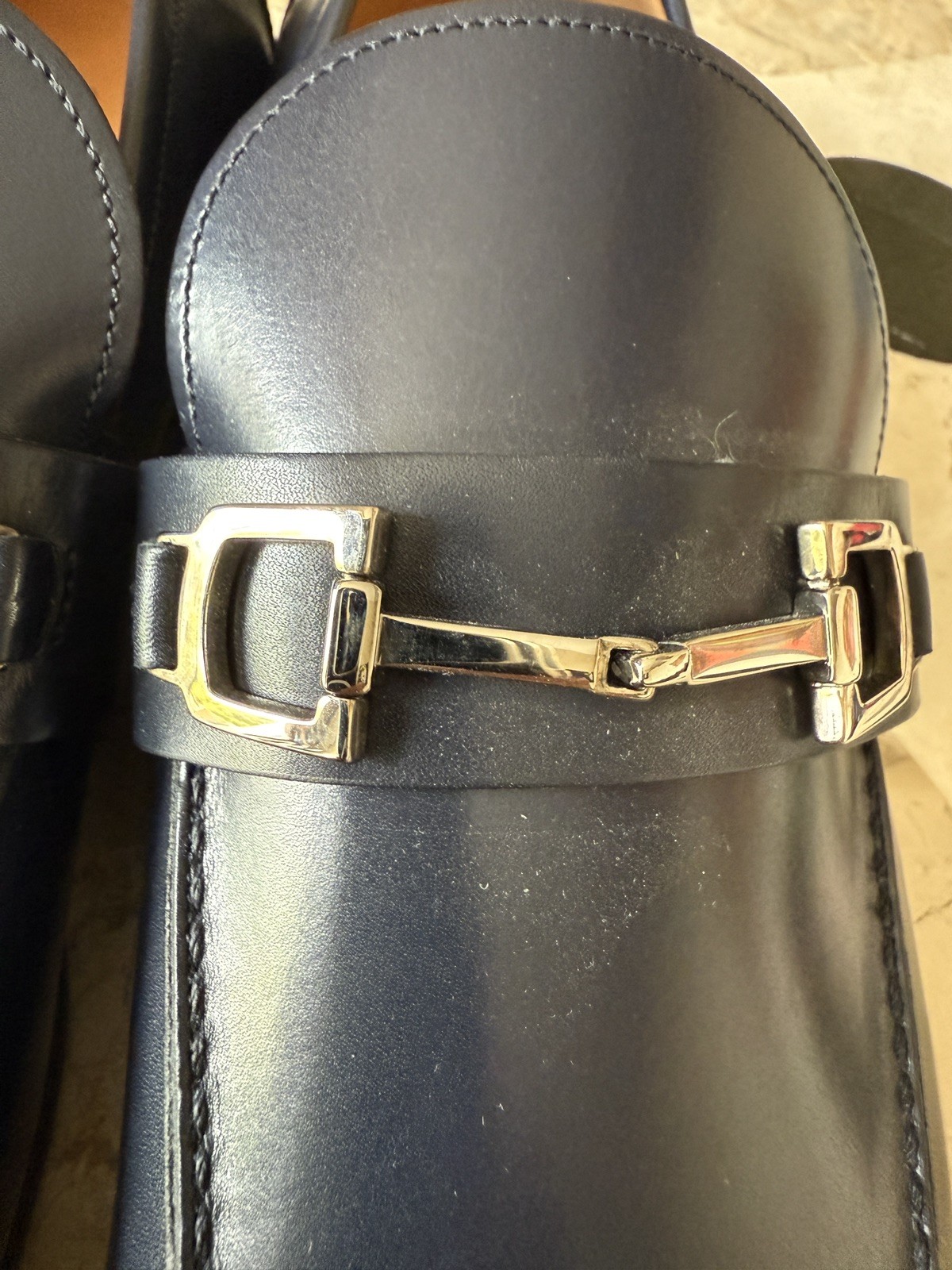 The product is a pair of Gucci men's loafers in blue leather with a silver buckle detail. These slip-on shoes feature an almond toe shape and are made with high-quality leather outsoles and linings. The GG buckle accents add a stylish touch to the casual loafers, making them a versatile option for various occasions throughout the year. Made in Italy, these UK size 10 shoes in US size 11 are a luxurious addition to any man's wardrobe. Free shipping to the US, Firm leather body and soles.