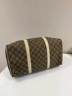 Timeless Gucci monogram canvas with beige leather accents Spacious barrel/duffle-style design with top handles Gold-tone hardware and a zip closure for security Great for everyday wear or travel