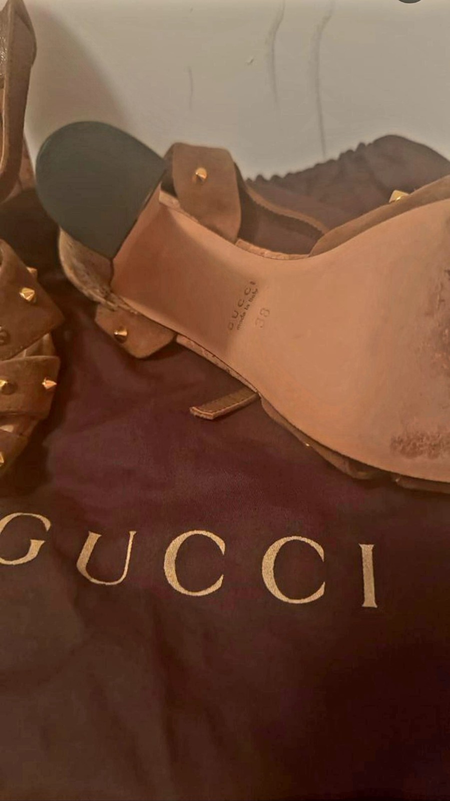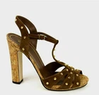 T he Gucci Brown Studded Suede Sandals in woman's size 38 are a stylish and versatile option for casual occasions. The high heel and strappy design add a touch of sophistication, while the brown suede material and leather lining ensure durability and comfort. The studded accents give these sandals a trendy edge, perfect for the summer and spring seasons. Made by the prestigious brand Gucci, these sandals are a chic addition to any wardrobe.