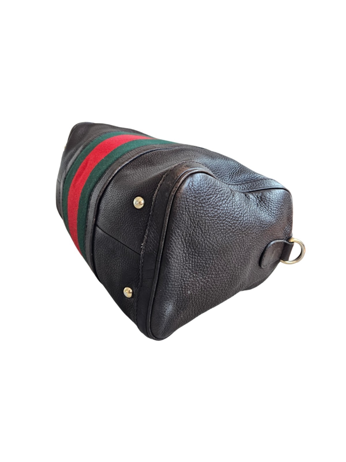 Gucci Brown Web Boston Leather Bag Attributes Material: Leather Color: Black Condition: Good condition, scuff on the leather corner & sign of used Inclusions: Dustbag, Strap Size: Length: 32.5cm Width: 18cm Height: 20 cm