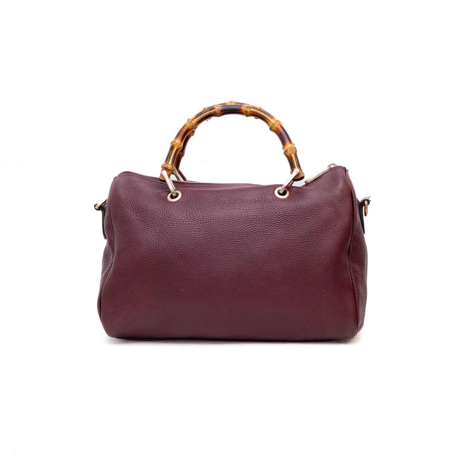 Authentic Gucci Burgundy Pebbled alfskin Leather Medium Bamboo shopper Boston Bag Description: Gucci Bamboo Satchel Bag, crafted from luxurious pebbled burgundy leather with Gucci’s iconic bamboo handles. Designed in Italy, this structured bag features a full zip top closure, removable leather shoulder strap, and beige canvas interior. A versatile and elegant piece ideal for daily use or special occasions. Features: • Brand: Gucci • Material: Pebbled leather • Color: Burgundy • Hardware: Gold-tone • Handles: Bamboo top handles and detachable leather strap • Interior: Beige canvas lining with one zip pocket • Closure: Top zipper • Country of Origin: Made in Italy • Serial Number: 353122 525040 • Measurements (Approx.): 30 cm (W) x 22 cm (H) x 13 cm (D) • Handle Drop: 10 cm | Strap Drop: 50 cm adjustable Condition: • Exterior: Overall very good condition with minor creasing and general signs of use • Strap: Shows heavy wear on one end (see detailed image) • Interior: Light discoloration and wear from use • Hardware: Light scratches and patina from normal wear Includes: Bag only – No dust bag or box Shipping: Ships with tracking