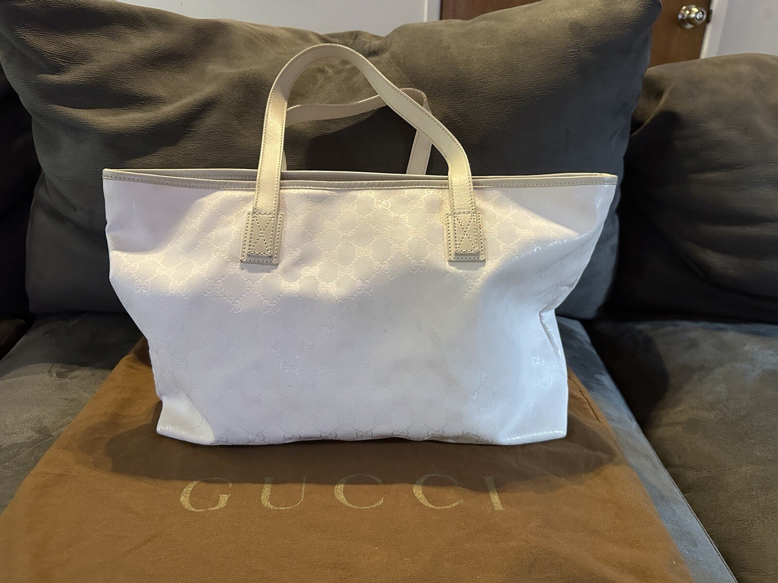 This Gucci Canvas leather Medium/Large Tote Handbag Shoulder Bag Designer Authentic is a pre-owned piece that is perfect for travel, casual outings, and workwear. Crafted from coated canvas in an off-white color, this tote exudes elegance and sophistication. The leather handle/strap material adds a touch of luxury, while the Gucci Supreme product line ensures authenticity. A must-have for any fashion-conscious woman, this bag is both stylish and functional. Size: Width: 46cm, Height: 30cm, handle drop: 22cm I have this bag for around 15 years and it’s always kept inside its dustbag. Size like LV never full MM. Good Preloved condition, minor rubbing and stains. Easy to clean and wipe off stain. Comes with dustbag only. Non refundable item.
