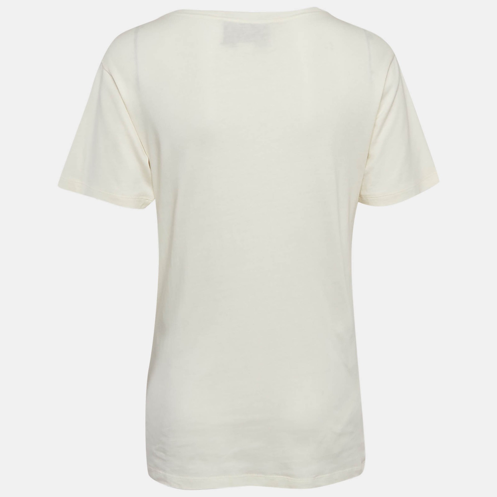 Elevate your everyday style with this meticulously crafted T shirt by Gucci. Impeccable tailoring ensures a perfect fit, while the breathable fabric offers unparalleled ease.Certified by The Luxury Closet - This item has gone through a detailed authentication process overseen by our experts. We offer a lifetime guarantee of authenticity on all our items. Import duties, taxes and charges are not included in the item price. These charges are the buyers responsibility. Please check with your country’s customs office to determine what these additional cost will be prior to buying. Our eBay Store About Us Contact Us Add to Favorite Sellers Gucci Cream Logo Print Cotton Jersey T-Shirt XXXS $163.9 Elevate your everyday style with this meticulously crafted T shirt by Gucci. Impeccable tailoring ensures a perfect fit, while the breathable fabric offers unparalleled ease. Product Details Brand Color Cream Dimensions Material Jersey Size XXXS Outsole Width Outsole Length Heel Height Includes The Luxury Closet Packaging Certified by The Luxury Closet This item has gone through a detailed authentication process overseen by our experts. We offer a lifetime guarantee of authenticity on all our items. How We Check The in-house team of experts at The Luxury Closet is highly trained to verify the authenticity and the condition of the luxury products. They ensure that only 100% authentic items are put on sale.The evaluation process is unique with its own mix of assessment criteria and differs according to the category. Each item is evaluated based on the following combination of hallmarks, hardware, stitching, symmetry, material, craftsmanship, stamping, codes, hologram stickers, and packaging. Our authenticators also check if the items have been modified or amended (e.g., aftermarket diamonds, replaced batteries, repaired bags, etc.) International Buyers Import duties, taxes and charges are not included in the item price. These charges are the buyers responsibility. Please check with your country’s customs office to determine what these additional cost will be prior to buying.