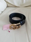 The belt appears unused, part of the tag still there and holes are clean, size 85 - 34, please see pictures. Belt is black leather and about 1.5in wide, buckle is 3in long and 2.25in tall.