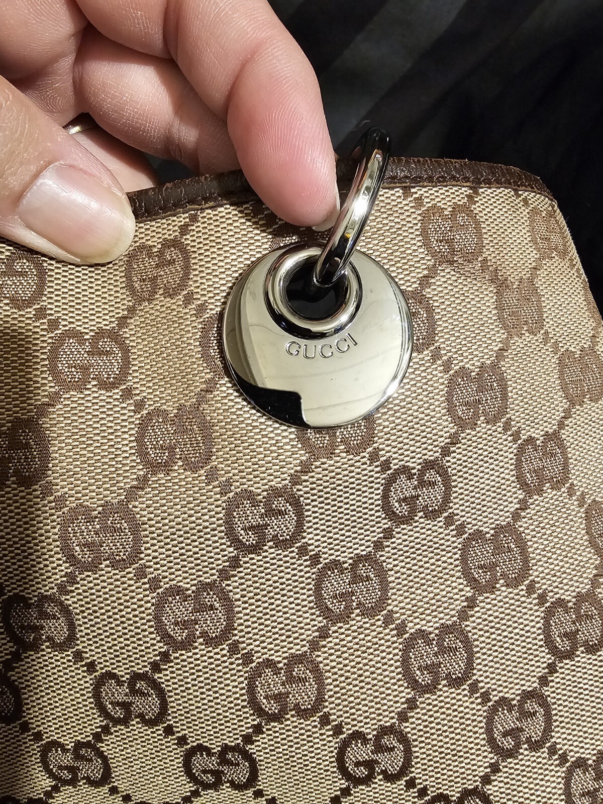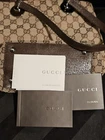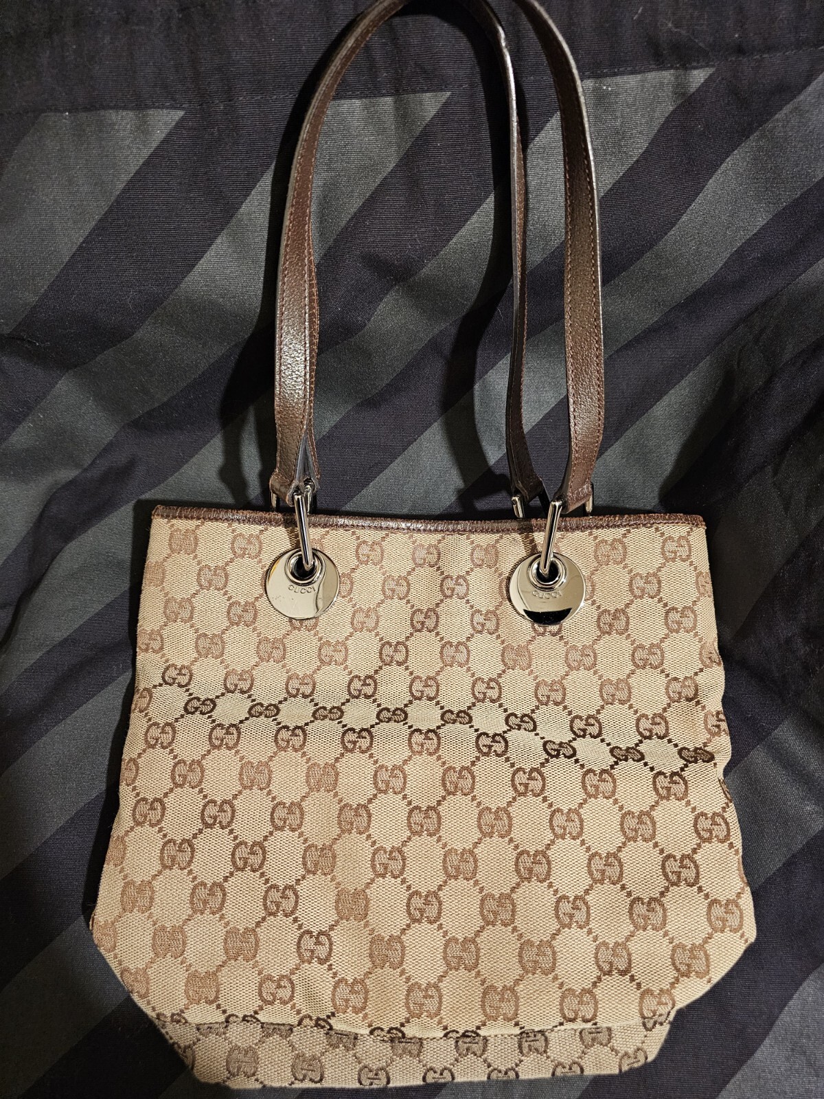 Pre-owned authentic Gucci Eclipse GG Shoulder Tote Bag. Outer canvas is in good condition. Leather straps are in good condition as well. Metal Gucci hardware on the tote where straps meet are in near perfect condition with minor wear. Inside of the tote is clean with to marks or stains. Inner zipper pocket functions properly. Tote comes with gucci information packet. Authenticity numbers under tag can be checked out online. Bag came from Japan.
