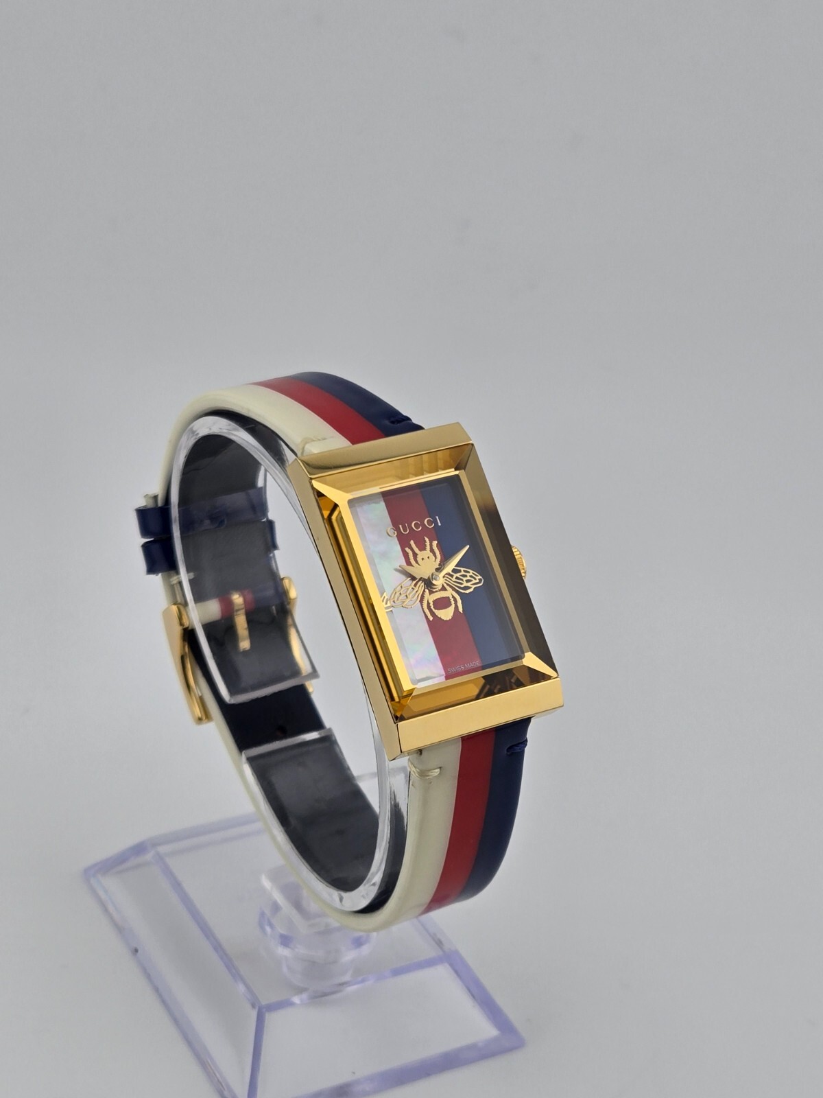 Gucci Women's G-Frame Multi-Color Quartz Ladies Watch - YA147409 ($1400 MSRP) New with Original Box and Tags! This watch is a Shelf Pull from one of the Major Department Stores. May find few micro scratches on the watch case/band, visible under a direct and strong light. The Gucci Women's G-Frame Multi-Color Quartz Ladies Watch - YA147409 exemplifies the brand's dedication to sophisticated design and impeccable craftsmanship. This elegant timepiece features a distinctive rectangular case made from high-quality stainless steel, measuring 21x34 mm with a thickness of 8 mm. The multi-color dial is protected by a scratch-resistant sapphire crystal, ensuring clarity and durability. Gold-tone hands and a gold-tone stainless steel bezel add a touch of luxury to the watch's overall aesthetic. Designed for women who appreciate both fashion and function, the G-Frame watch comes with a vibrant multi-color strap that adds a playful yet refined touch to any outfit. The strap, measuring 14 mm in width and designed to fit a men's standard length, is secured with a buckle clasp, providing a comfortable and adjustable fit. The watch is water-resistant up to 30 meters, making it suitable for everyday wear and light water activities. Powered by a precise quartz movement, this analog watch guarantees reliable timekeeping. The snap-down case back and push/pull crown add to the watch's practical features, ensuring ease of use and maintenance. With its combination of Swiss craftsmanship and Italian design flair, the Gucci Women's G-Frame Multi-Color Quartz Ladies Watch - YA147409 is a perfect accessory for those who demand the highest quality and style. Whether worn as an intricate evening accessory or a stylish everyday piece, this watch seamlessly blends traditional elegance with contemporary sophistication. Features Brand: Gucci Gender: Female Model: YA147409 Series: G-Frame Movement: Quartz Water Resistant: 30 Meters Band Color: Multi-color Band Width: 14 mm Band Length: Men's Standard Band Type: Strap Clasp: Buckle Case Material: Stainless Steel Case Size: 21x34 mm Case Thickness: 8 mm Case Shape: Rectangle Case Back Type: Snap-down Display Type: Analog Dial Color: Multi-color Crystal: Sapphire Crown: Push/Pull Bezel: Gold-Tone Stainless Steel Dial Hands: Gold-Tone Fast and Free Shipping You're already purchasing the item. Why pay additional for shipping, especially slow shipping? We get your order shipped out within 1-business day and delivered to your doorstep as quickly as possible. Competitive Pricing With our dynamic pricing model, our prices are always competitive. Our prices are some of the lowest that you will find on the internet. Rest assured that you're getting a good deal when purchasing with us. 30-day Money Back Guarantee We are committed to making sure that you leave this transaction satisfied. If you're unhappy with the product for any reason, you may return it back for your money-back or a replacement within 30 days. No questions asked!
