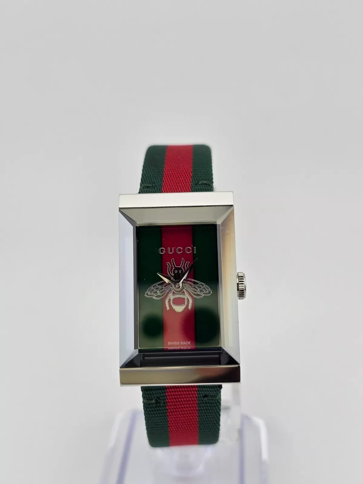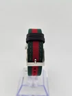 Gucci G-Frame Women's Green & Red MOP Dial Quartz Watch - YA147413 ($1150 MSRP) With Original Box and Tags! This watch is a Shelf Pull from one of the Major Department Stores. May find few micro scratches on the watch case/band, visible under a direct and strong light. The Gucci Women's G-Frame YA147413 Green & Red MOP Dial Ladies Watch is an exquisite timepiece that seamlessly merges luxury and sophistication. Encased in stainless steel, this watch features a unique red and green fabric strap, creating a striking contrast against the silver-tone hands and square case shape. The dial is a masterpiece, showcasing a mesmerizing green and red mother of pearl design. The scratch-resistant sapphire crystal ensures durability and protects the dial from scratches and scuffs. Powered by a precise quartz movement, this watch provides accurate and reliable timekeeping. The tang clasp on the fabric strap ensures a secure and comfortable fit on the wrist. With water resistance up to 50 meters (165 feet), the watch is suitable for everyday wear and can withstand light splashes. The Gucci G-Frame YA147413 Green & Red MOP Dial Ladies Watch is not just a timekeeping accessory; it's a statement piece that complements both casual and dressy attire. With its distinctive design and Swiss craftsmanship, this watch reflects the brand's commitment to elegance and style. Features Stainless steel case with a red and green fabric strap. Fixed stainless steel bezel. Green and red mother of pearl dial with silver-tone hands. Dial Type: Analog. Quartz movement. Scratch resistant sapphire crystal. Pull / push crown. Solid case back. Square case shape. Case dimensions: 21 mm x 34 mm. Case thickness: 8 mm. Tang clasp. Water resistant at 50 meters / 165 feet. Functions: hour, minute. Dress watch style. Watch label: Swiss Made. Fast and Free Shipping You're already purchasing the item. Why pay additional for shipping, especially slow shipping? We get your order shipped out within 1-business day and delivered to your doorstep as quickly as possible. Competitive Pricing With our dynamic pricing model, our prices are always competitive. Our prices are some of the lowest that you will find on the internet. Rest assured that you're getting a good deal when purchasing with us. 30-day Money Back Guarantee We are committed to making sure that you leave this transaction satisfied. If you're unhappy with the product for any reason, you may return it back for your money-back or a replacement within 30 days. No questions asked!