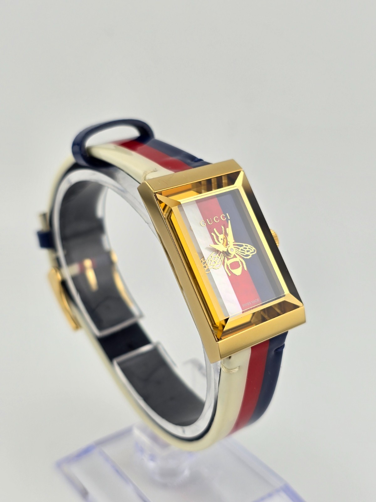 Gucci G-Frame YA147409 Women's Multi-Color Nylon Strap MOP Dial Watch ⌚ ✨ Key Features Brand: Gucci Model: G-Frame Case Size: 34 mm Movement: Quartz Band Material: Nylon ⌚ Condition Unworn but not flawless — light scratches or blemishes may be visible on the case or bracelet. Original box and tags included. 💯 Authenticity Guarantee All of our watches are 100% authentic. We do not sell replicas or imitations. Every piece is carefully inspected before shipping to ensure accuracy and quality. Every battery-operated watch will have a brand-new battery installed before it is shipped. 🚚 Shipping & Returns We take great care in packaging and shipping each watch to ensure it arrives safely. Orders ship quickly and include tracking as soon as the item is dispatched. All shipments are sent with secure carriers and are fully trackable for your peace of mind. Returns are accepted within 30 days of delivery. The watch must be returned in the same condition as received, with any included accessories or packaging. Once inspected, refunds are processed promptly to your original payment method. Questions before or after purchase? Message us anytime — we’re here to help.
