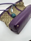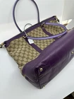 The Gucci GG Canvas Tote Bag is a stylish and luxurious accessory for women. With a trapezoid shape and a zip closure, this tote features the iconic Gucci GG pattern on beige/brown GG canvas with purple leather accents. The bag is crafted in Italy and has gold hardware, adding a touch of sophistication. The purple leather handles/straps have a 18cm drop, providing comfort and convenience for carrying the bag. This tote is a perfect blend of fashion and function for the modern woman.