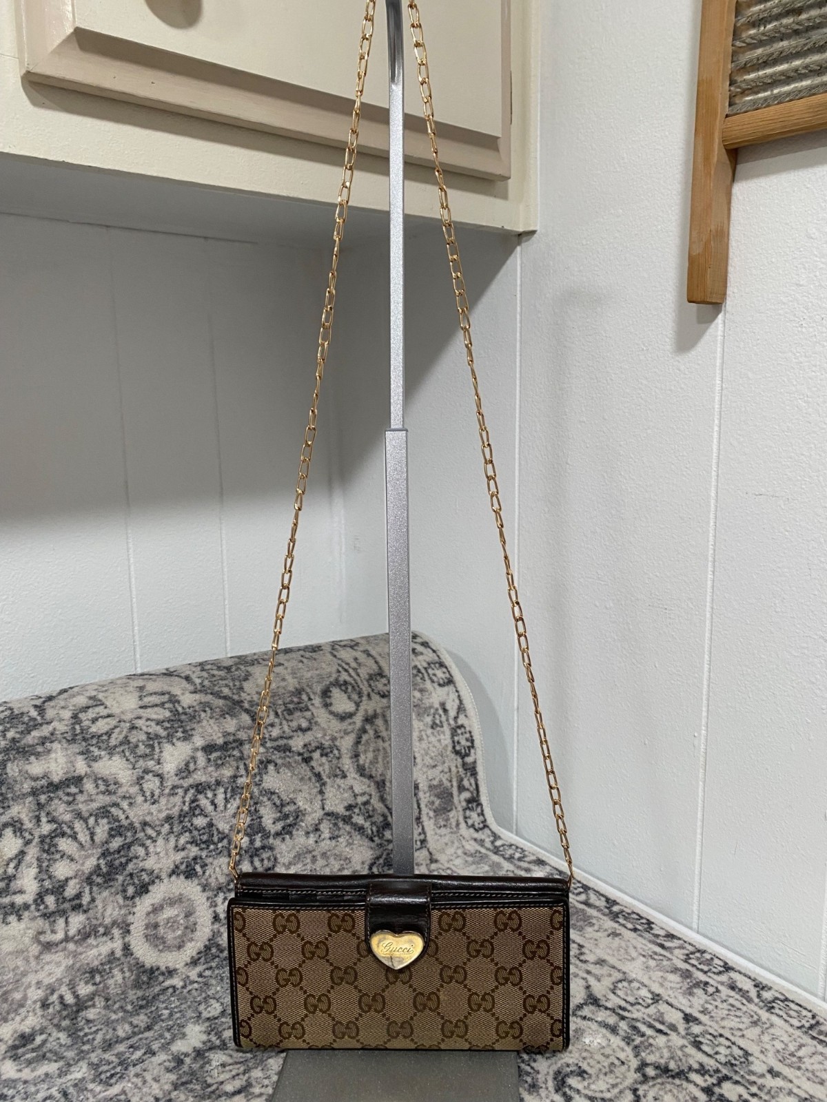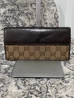 Gucci GG Coated Canvas and Leather Continental Bifold Wallet in Tan canvas and Brown leather Outside envelope pocket with snap, inside credit card slots, logo hardware and snap closure. Non-branded chain strap included Measurements: Height- 3 3/4” Length- 7 1/2” Bttm Width- 1/2” Strap drop- 18.5 Great condition for age of wallet, some tarnishing on the heart Gucci hardware No rips, tears, stains or damages. See pics for more details & fabric content Fast shipping & pet/smoke free