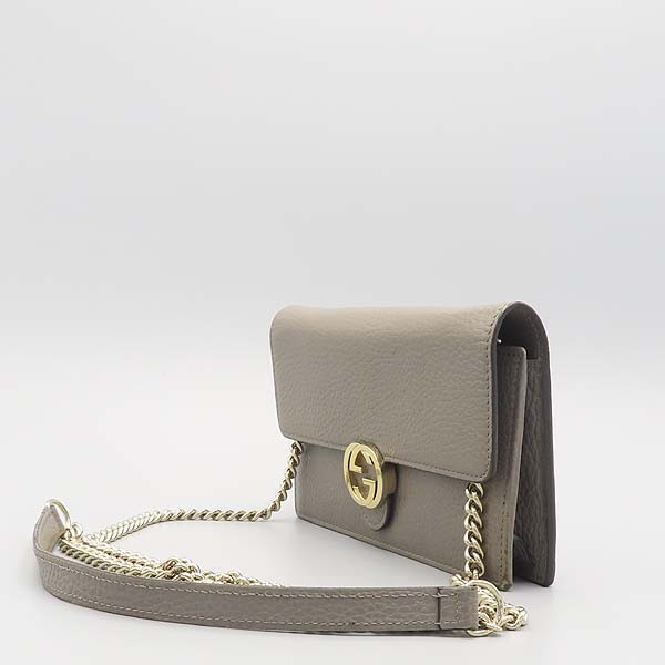 Size: 19 cm wide/ 11.3 cm/ width 3 cm/ strap height 58 cm/ strap height: gray accessories: Gucci (Gucci) 510314 gold GG interlocking gray leather WOC long sleeve and mini crossbody bag [Mokdong Hyundai store]. The material is leather. There are 16 kard storage pockets on the inside. This is a coin purse with a zipper pocket. [Note when purchasing] There is a feeling of use on the corner. **Due to the nature of second-hand luxury goods, there may be stains not visible in the image. **